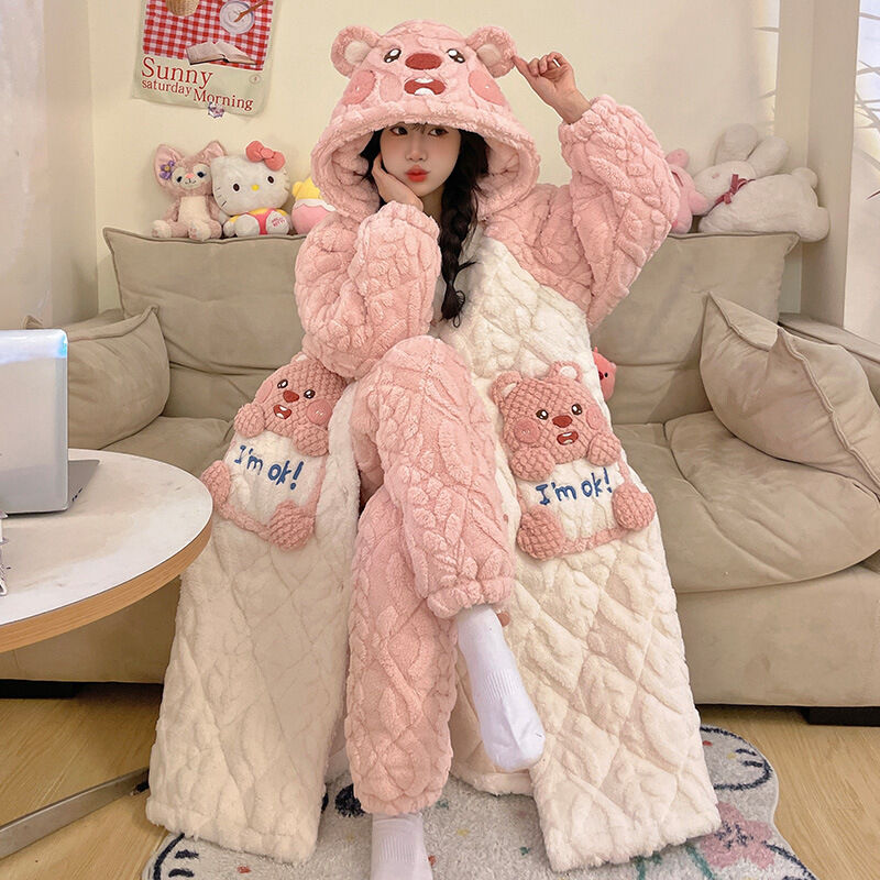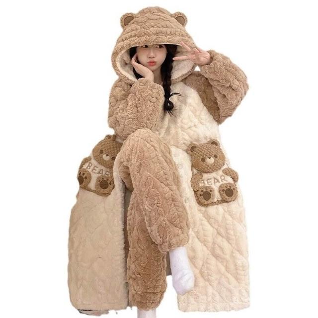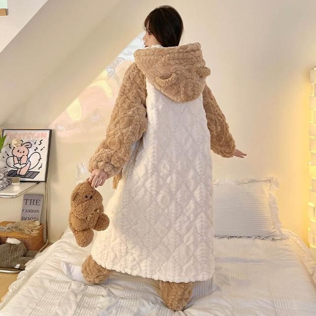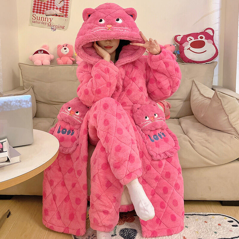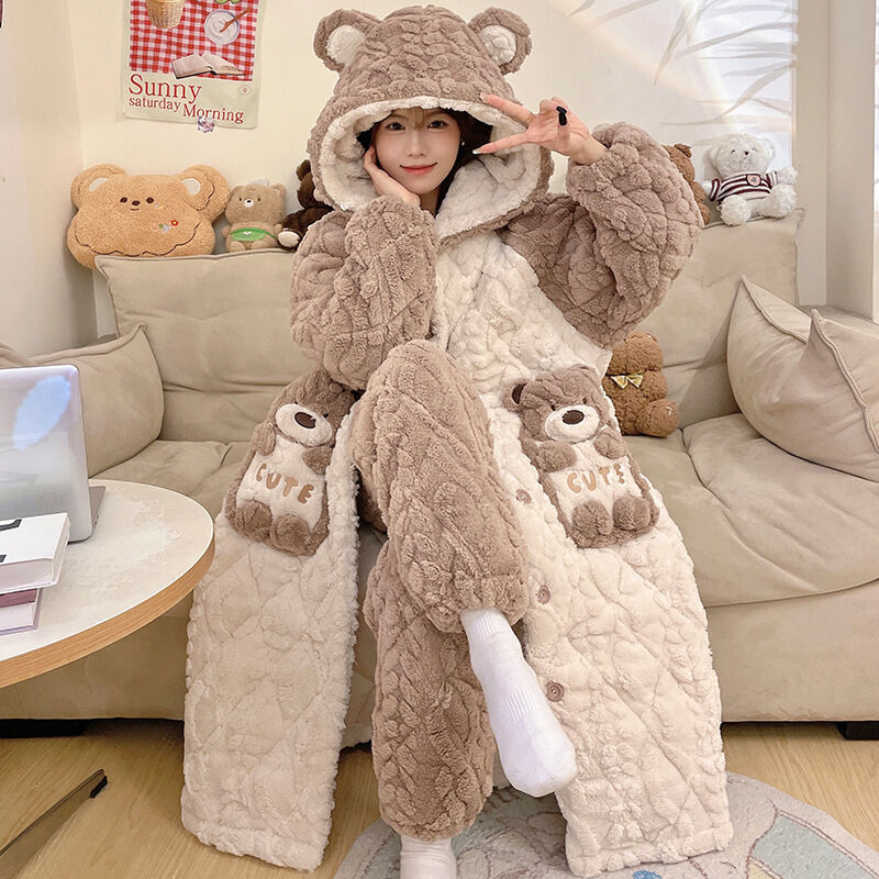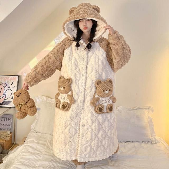 三層夾棉睡衣女秋冬季加絨加厚珊瑚絨連帽睡袍可愛浴袍冬天家居服