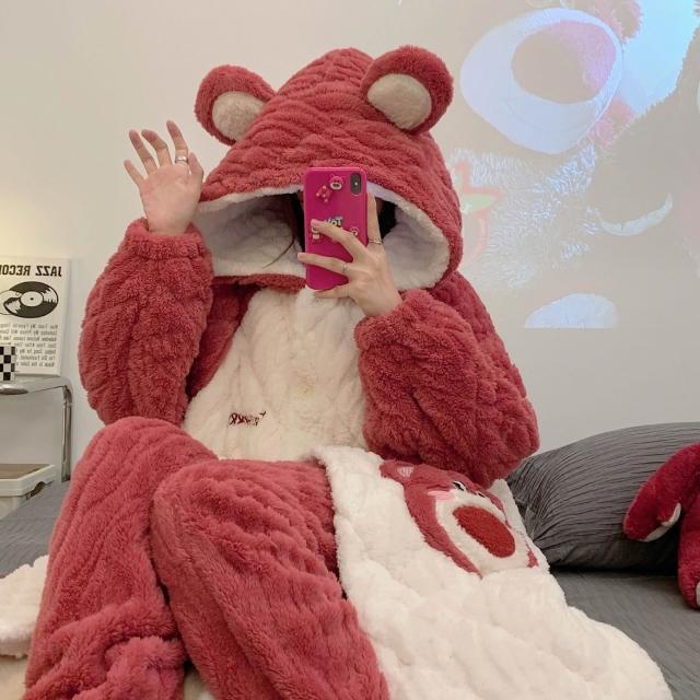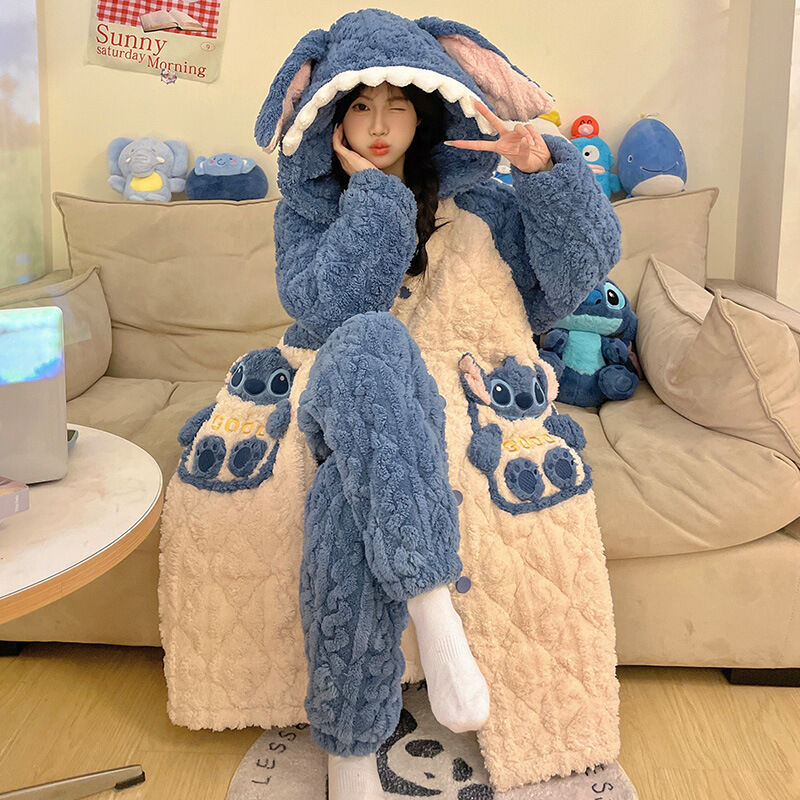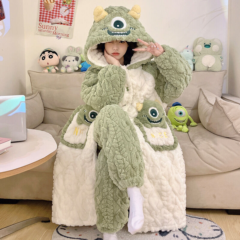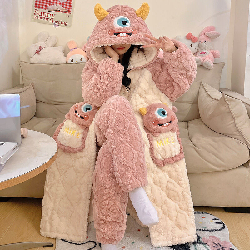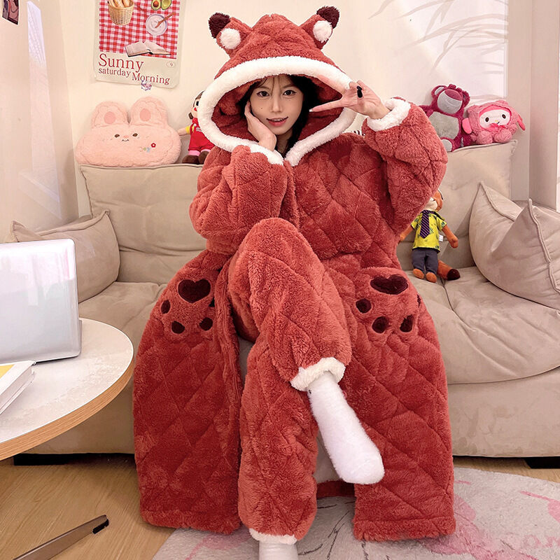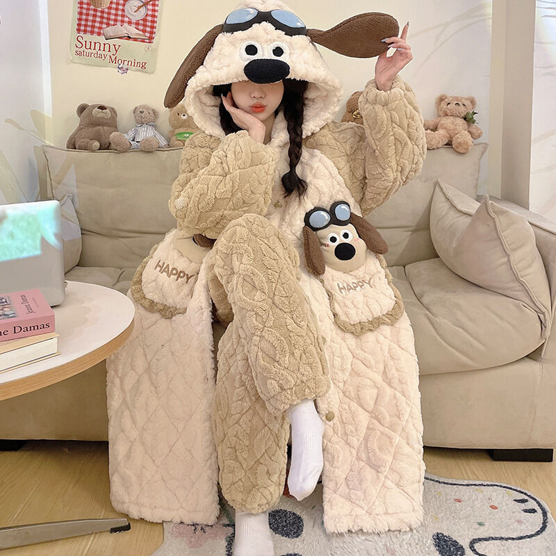 三層夾棉睡衣女秋冬季加絨加厚珊瑚絨連帽睡袍可愛浴袍冬天家居服