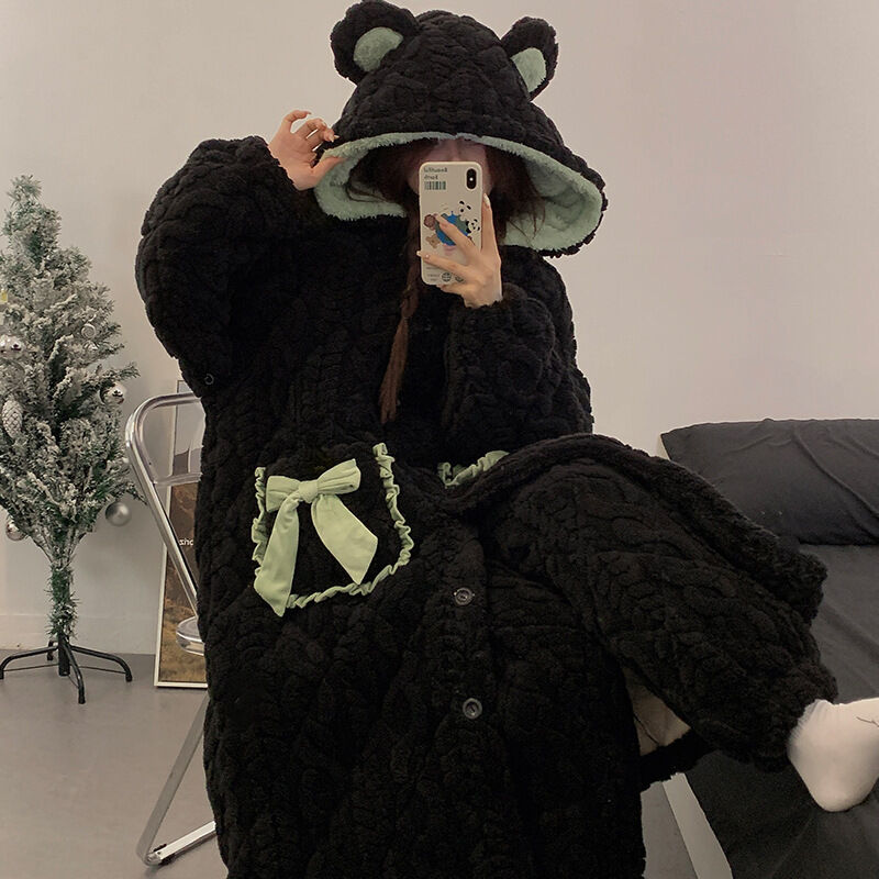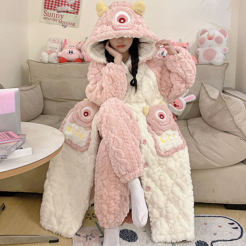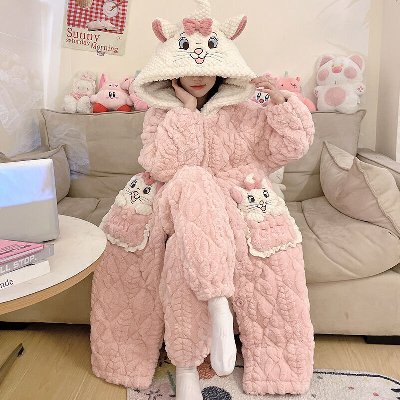 三層夾棉睡衣女秋冬季加絨加厚珊瑚絨連帽睡袍可愛浴袍冬天家居服