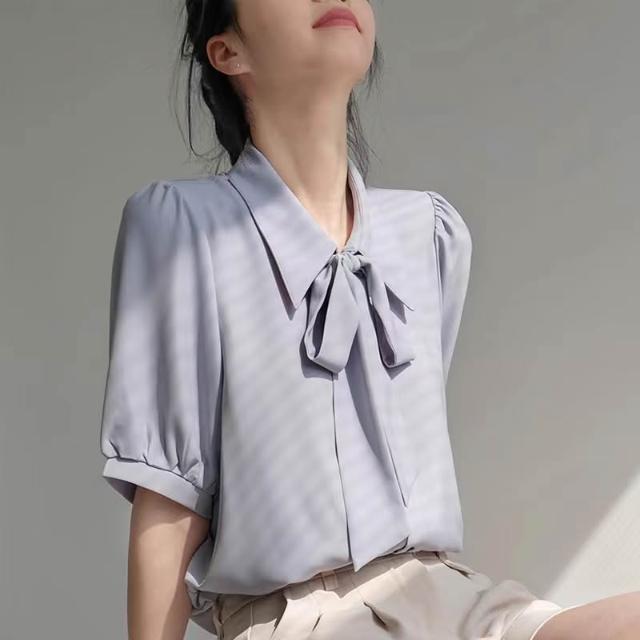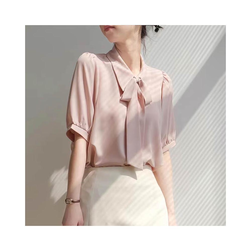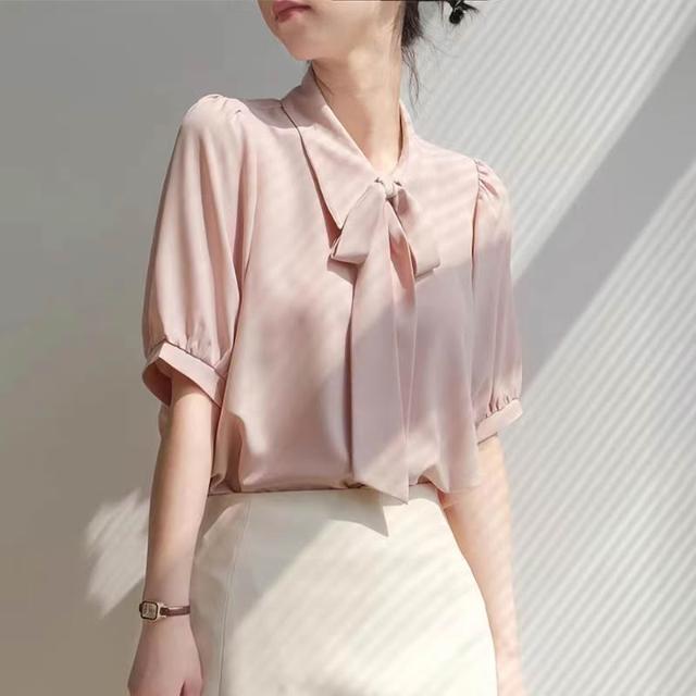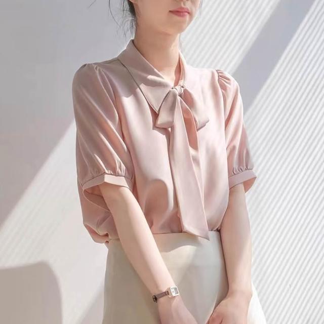 新品 上衣 短袖 粉色飄帶雪紡短袖襯衫女夏薄款韓系溫柔甜美洋氣垂感小眾港風襯衣 居之雅