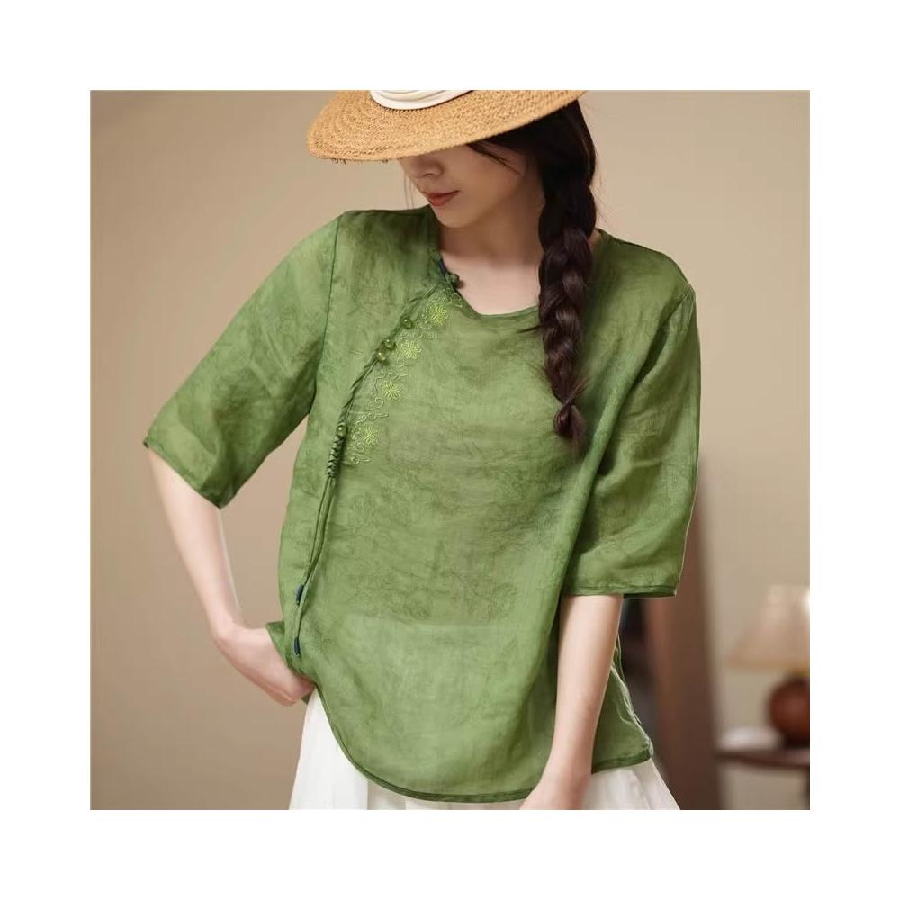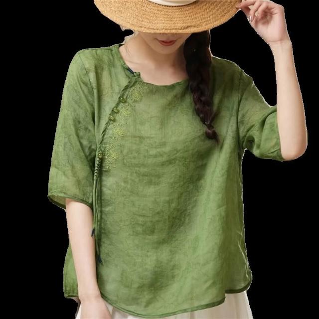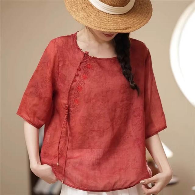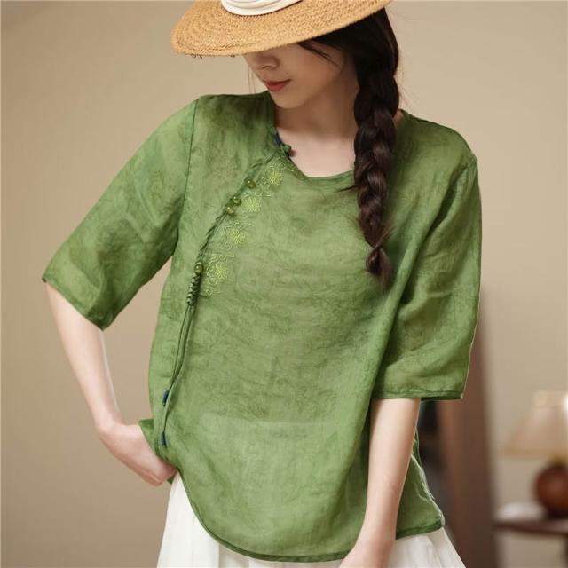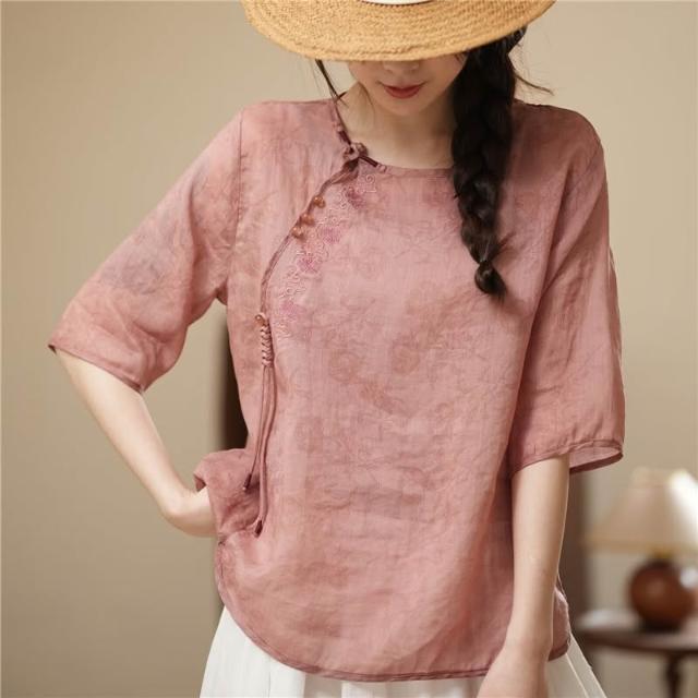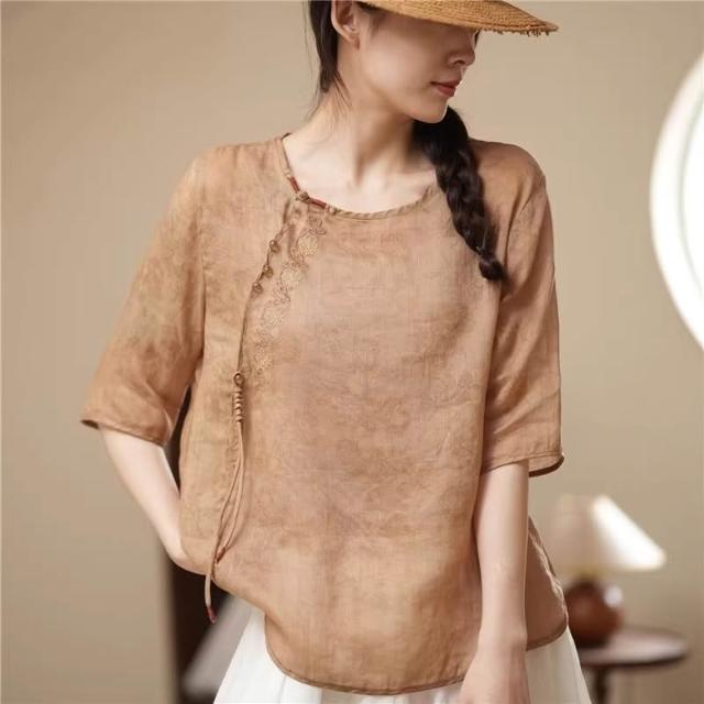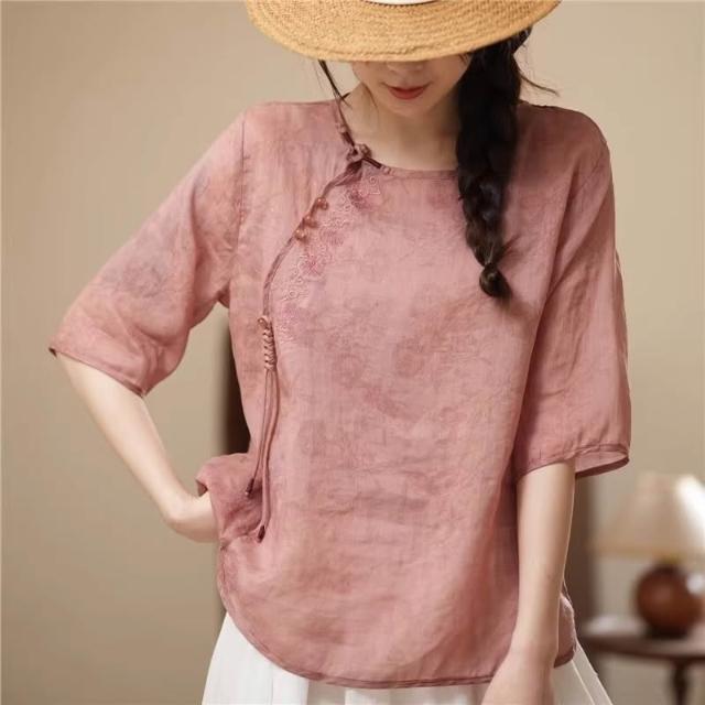 新品 上衣 短袖 新中式上衣女高端2024年夏季新款襯衫玉石盤扣流蘇設計 居之雅