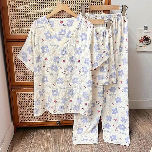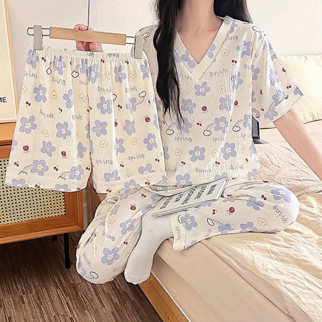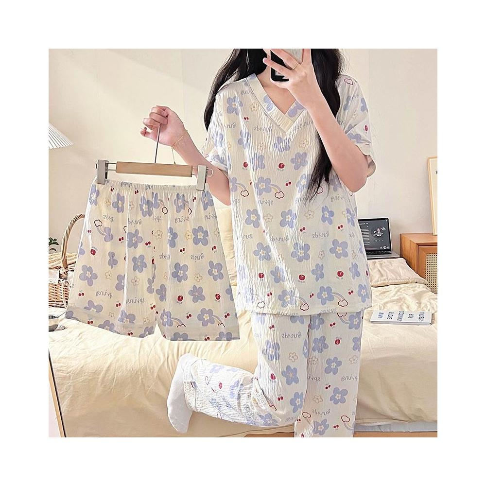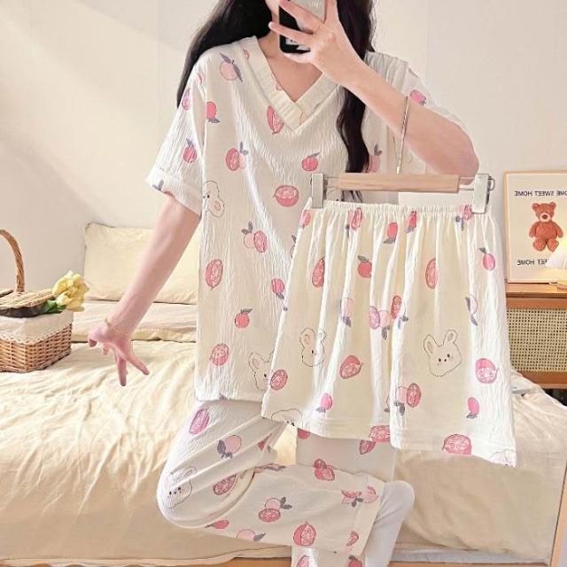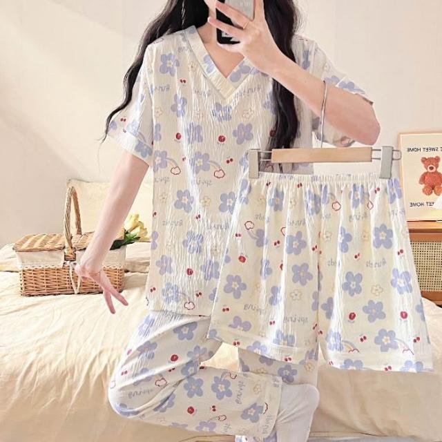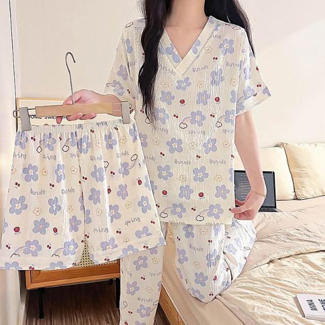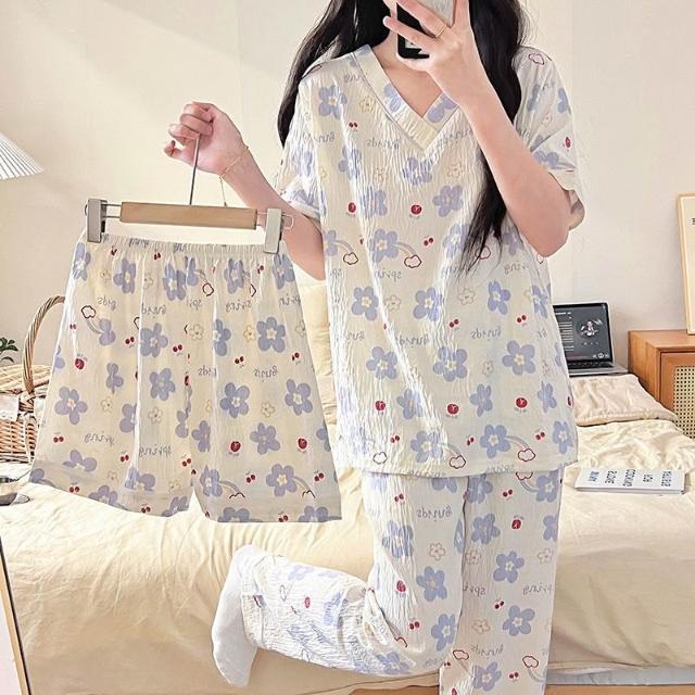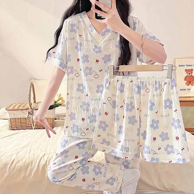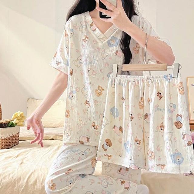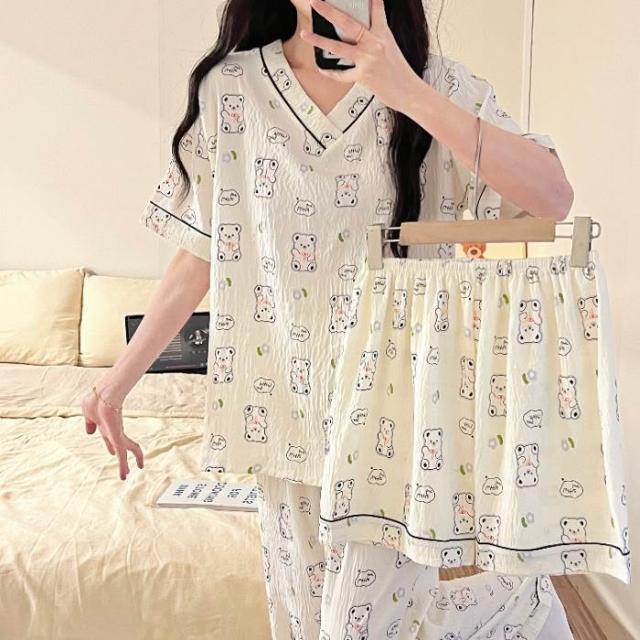 居家睡衣 純棉睡衣 長短袖睡衣 爆款雲朵棉V領三件套睡衣女夏季新款卡通短袖短褲長褲家居服套裝 居之雅