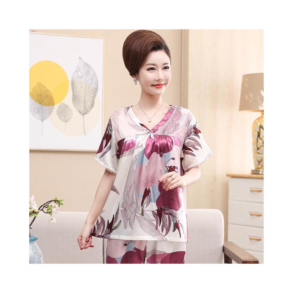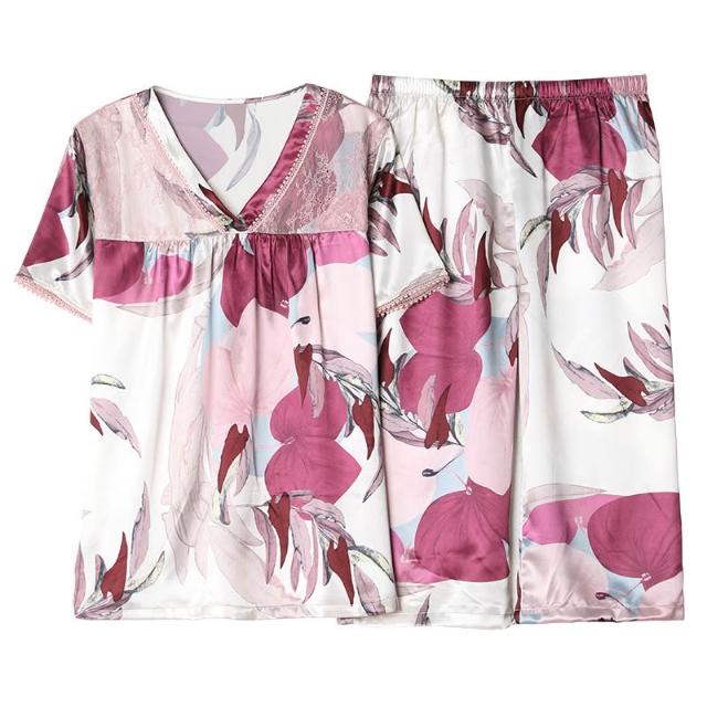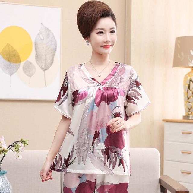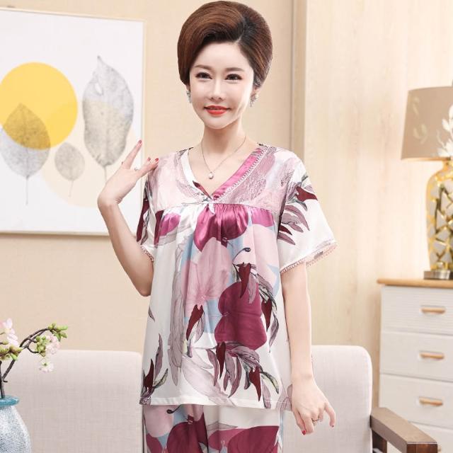 新品 夏季 睡衣 夏天冰絲睡衣女士絲綢中年人媽媽夏季短袖七分褲休閑套頭家居服薄 居之雅