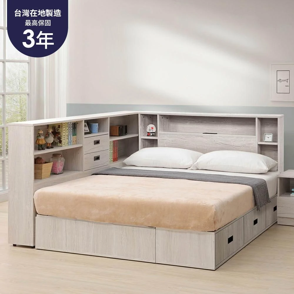 大象傢俱台灣製造|Linda 5尺 雙人收納床組三件組 床底收納箱 床邊櫃 床頭櫃 收納床架 附插座免組裝 最高3年保固 台灣製