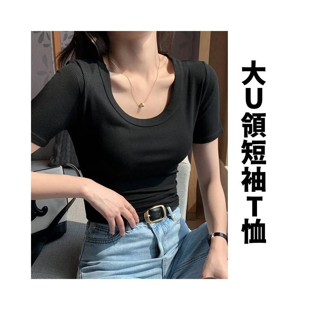 大U領短袖T恤《台灣出貨》女短T 素T 白T 螺紋T恤 彈力修身顯瘦 性感大圓領 圓領T恤