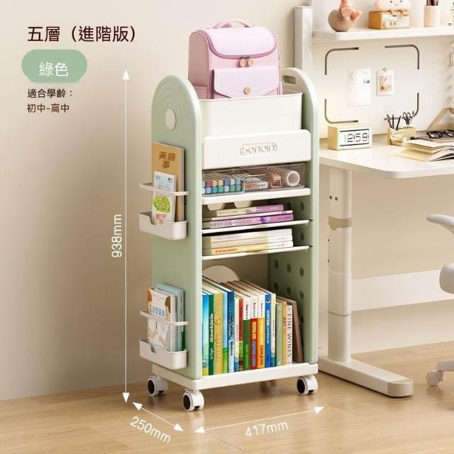 五層大容量兒童移動書架 落地式多層書包收納推車 附輪可推動繪本玩具書櫃子 新手爸媽育兒閱讀環境規劃 居家學習分類整理架