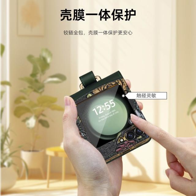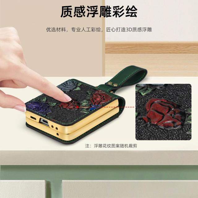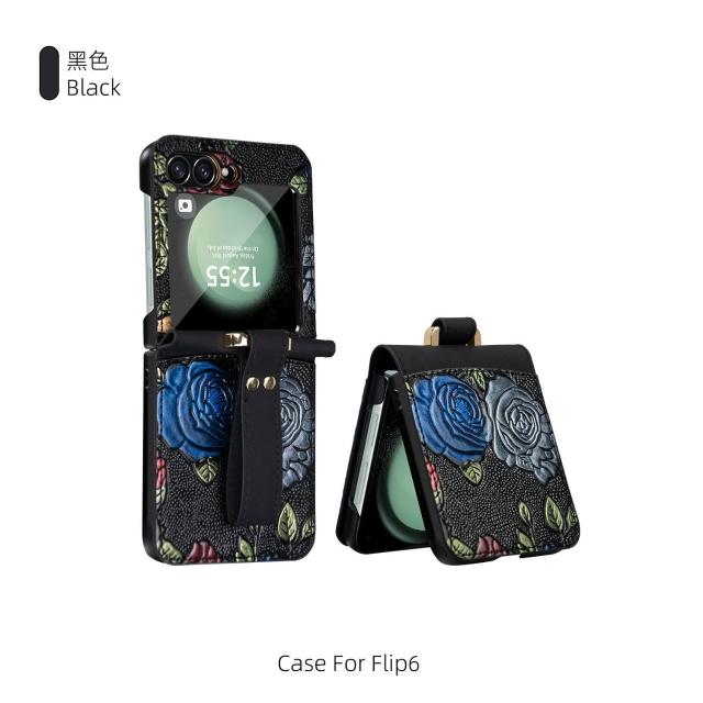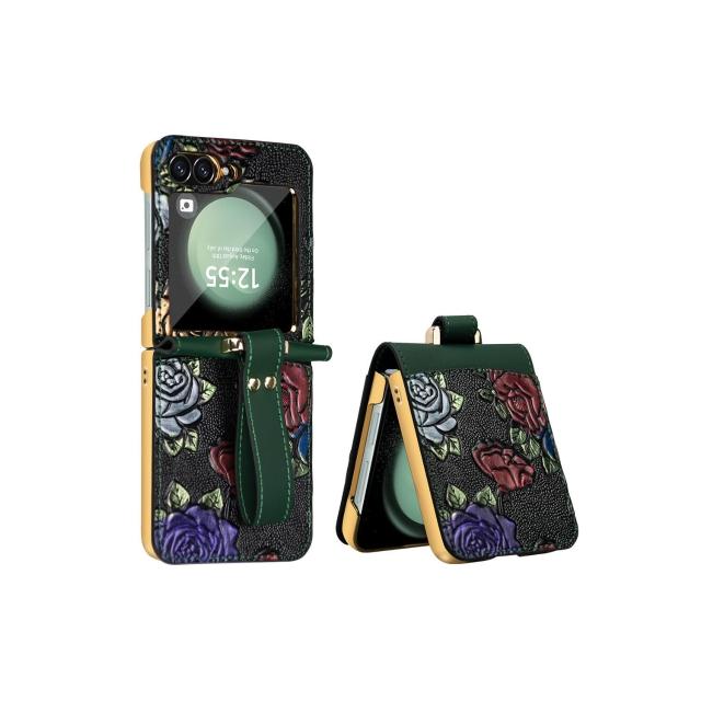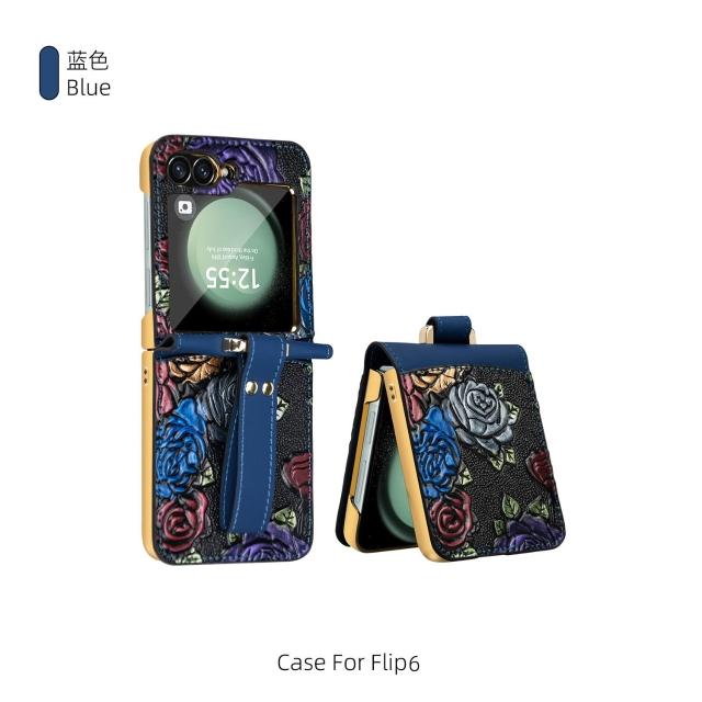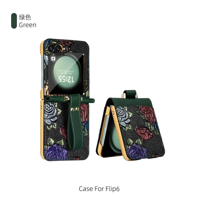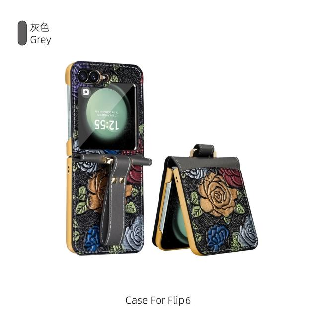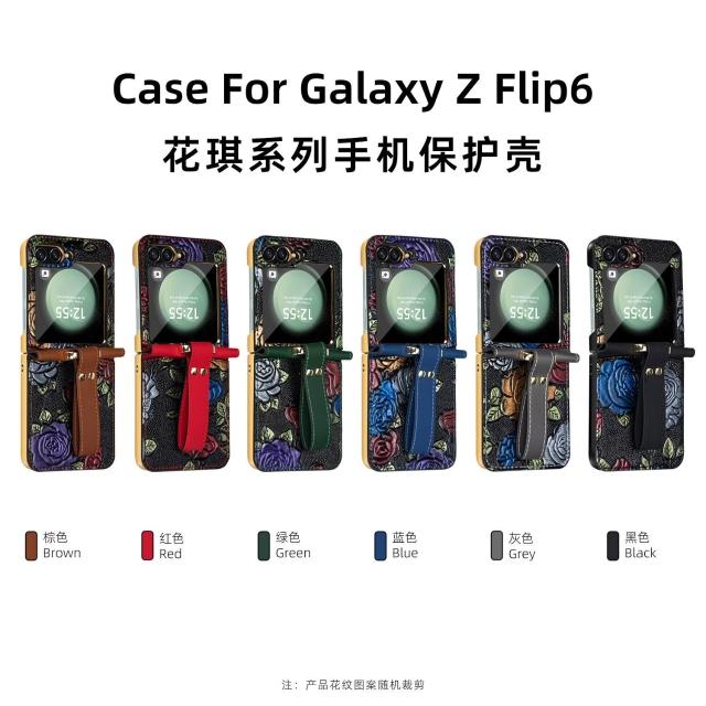 新款工廠直銷適用三星zflip6電鍍防摔手機殼浮雕彩繪腕帶高級保護