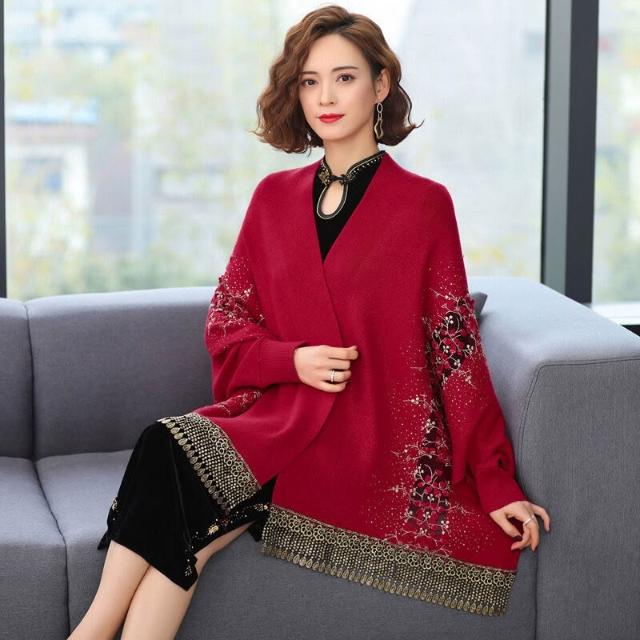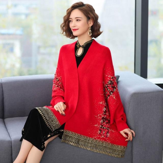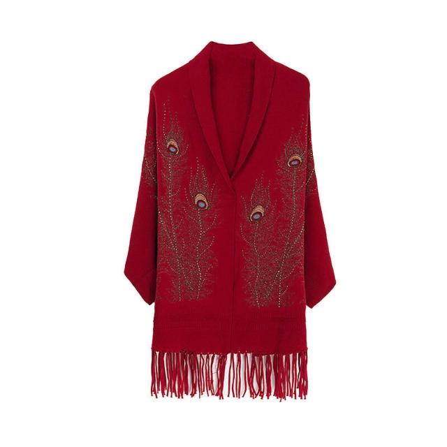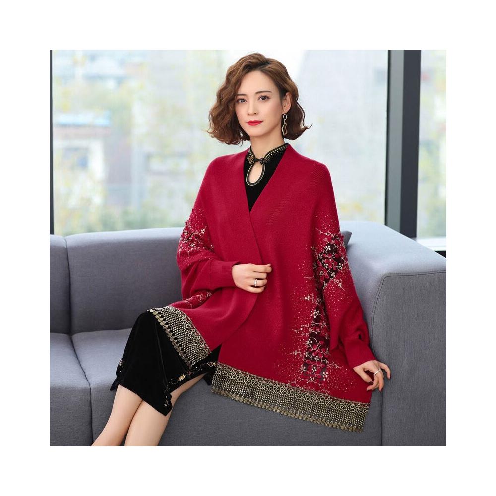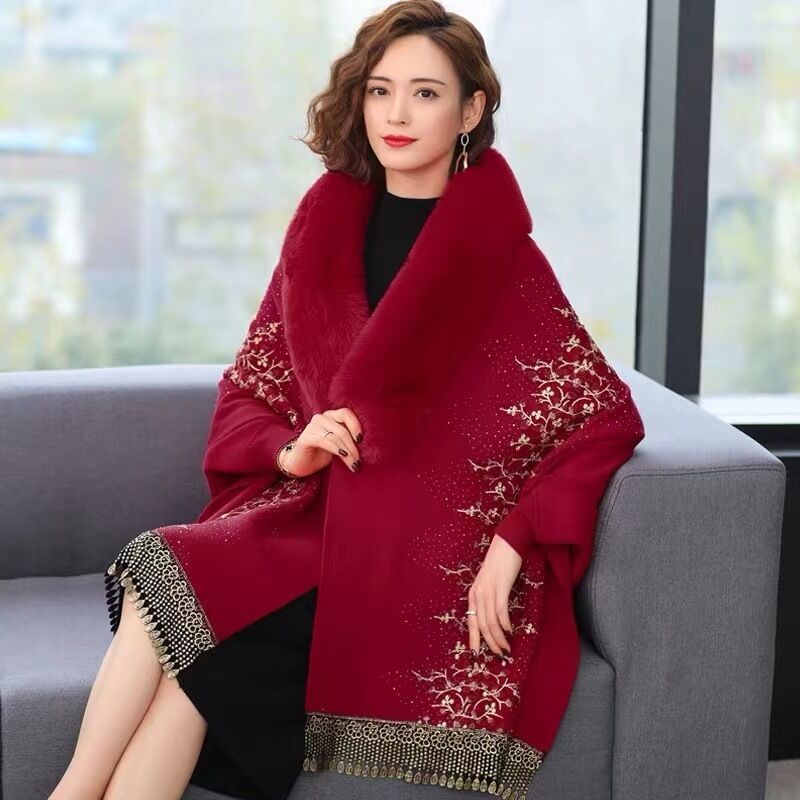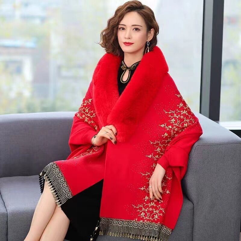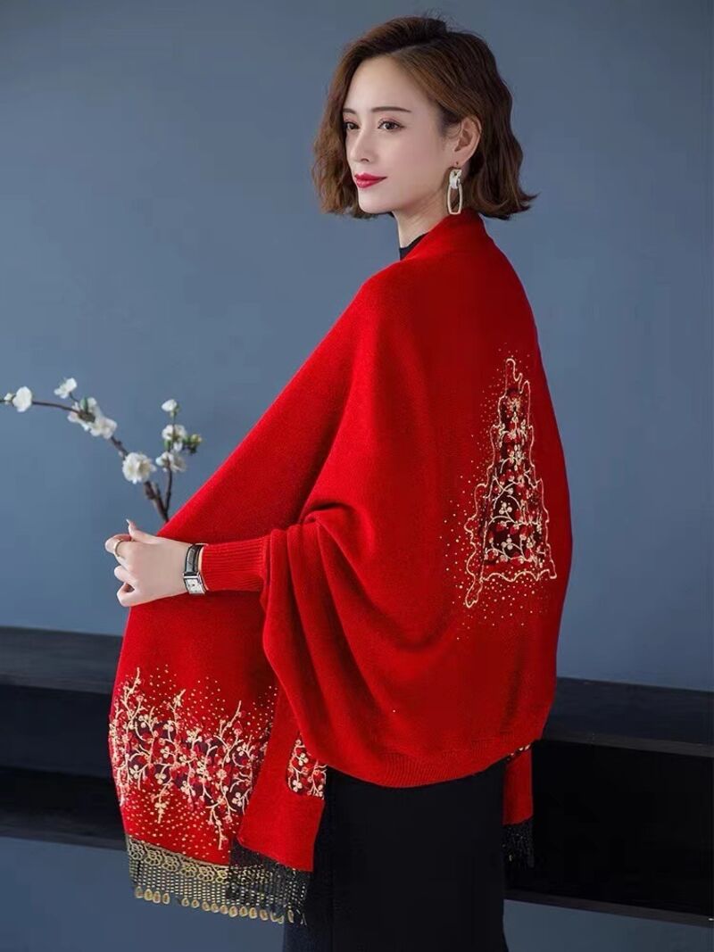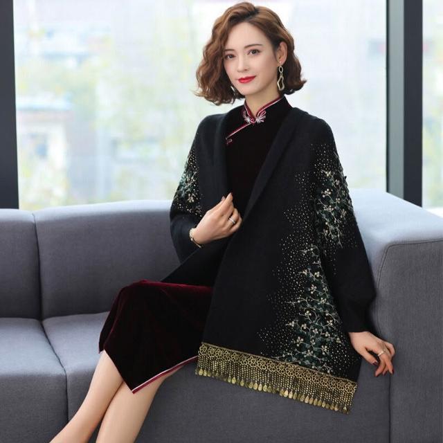 圍巾 絲巾 圍脖 披肩 秋冬新款圍巾披肩旗袍披肩女百搭外套高端喜婆婆披風繡花流蘇針織