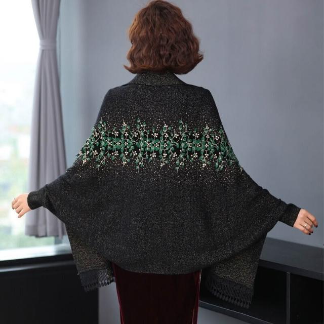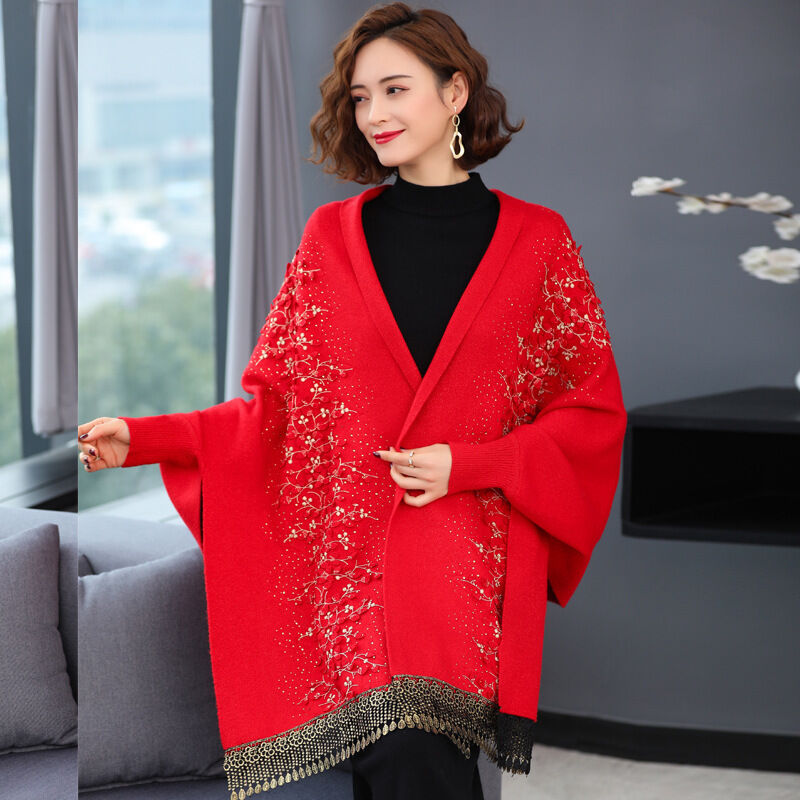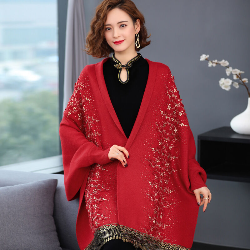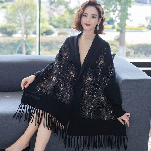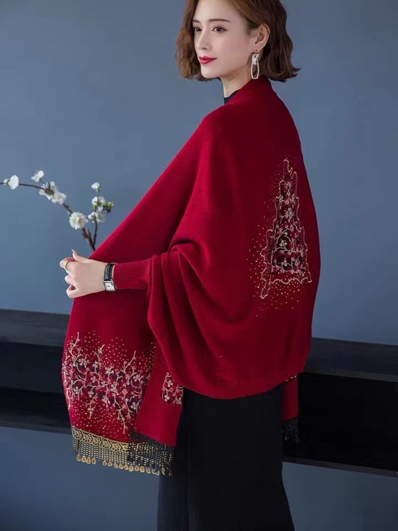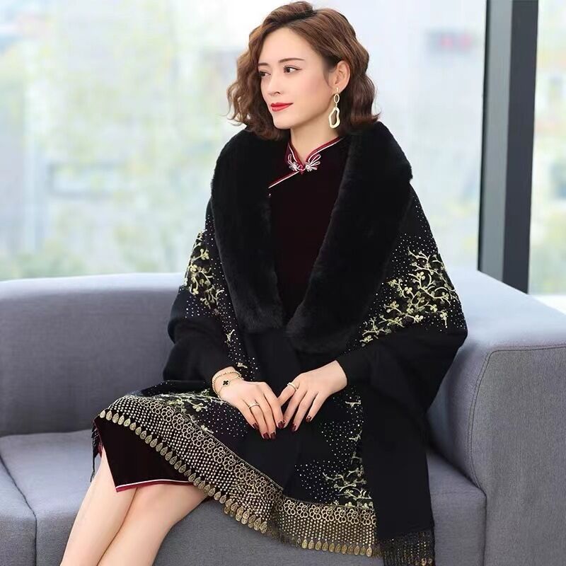 圍巾 絲巾 圍脖 披肩 秋冬新款圍巾披肩旗袍披肩女百搭外套高端喜婆婆披風繡花流蘇針織
