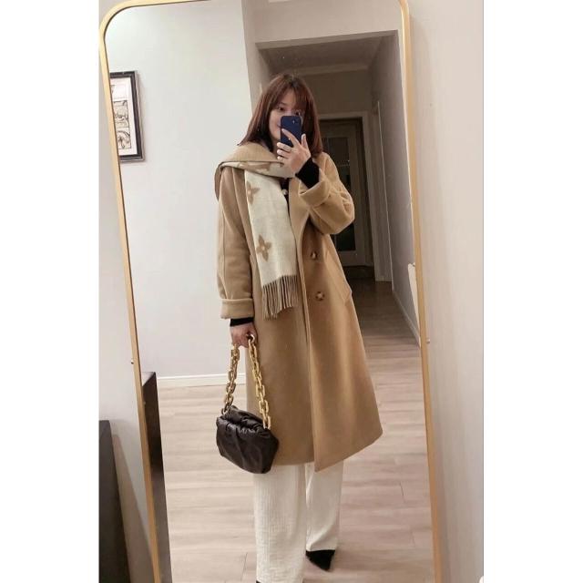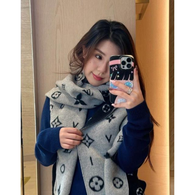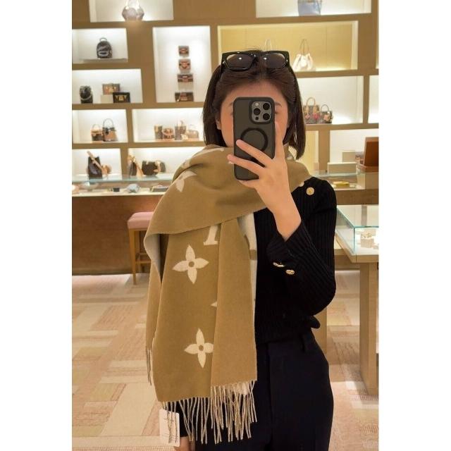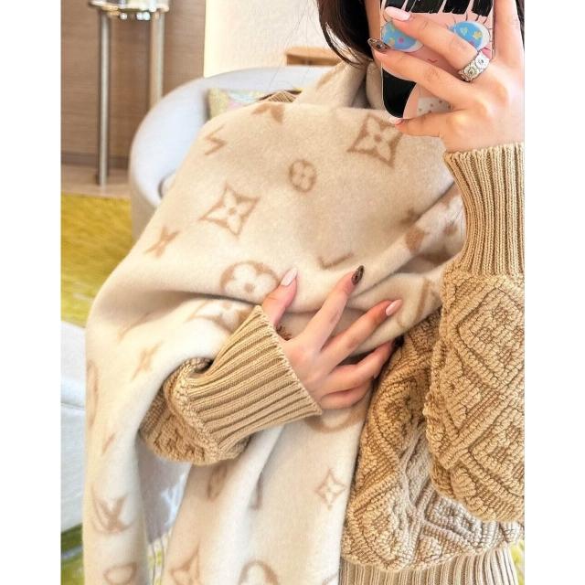 圍巾 絲巾 圍脖 披肩 芯片正確版本老花雙面黑灰羊絨流蘇圍巾披肩兩用女士長款百搭圍脖