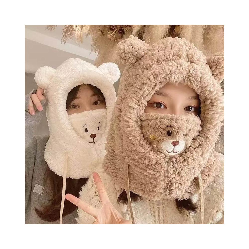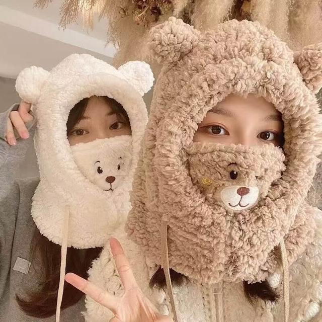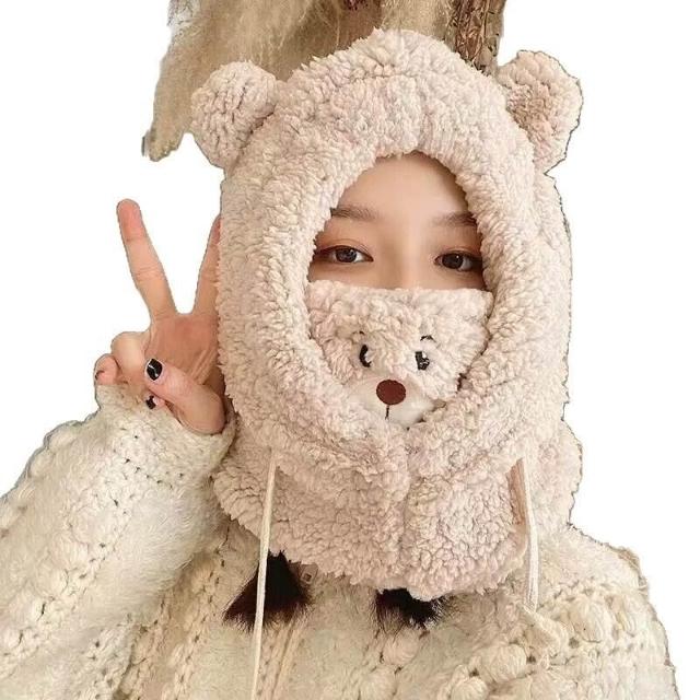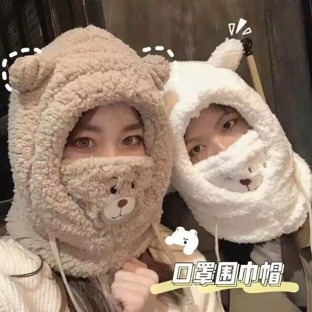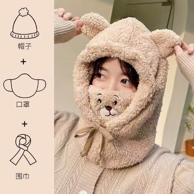 帽子 成人帽 冬季可愛小熊圍巾帽子保暖一體帽學生羊羔毛韓版女帽口罩毛絨帽子
