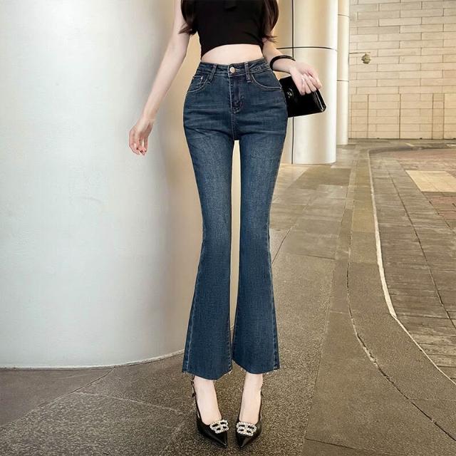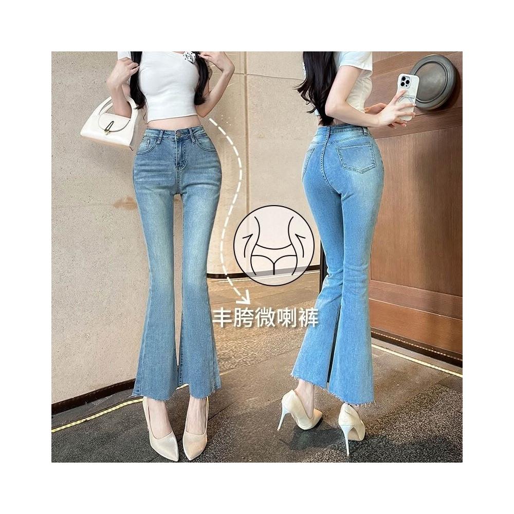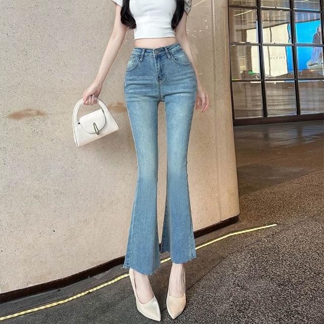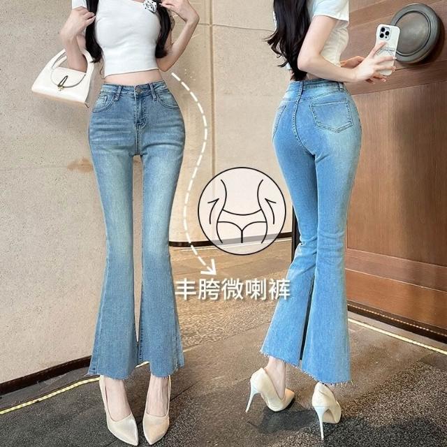 豐胯細腰~九分微喇叭褲巨顯腿直獨特水洗淺色百搭彈力軟牛仔褲