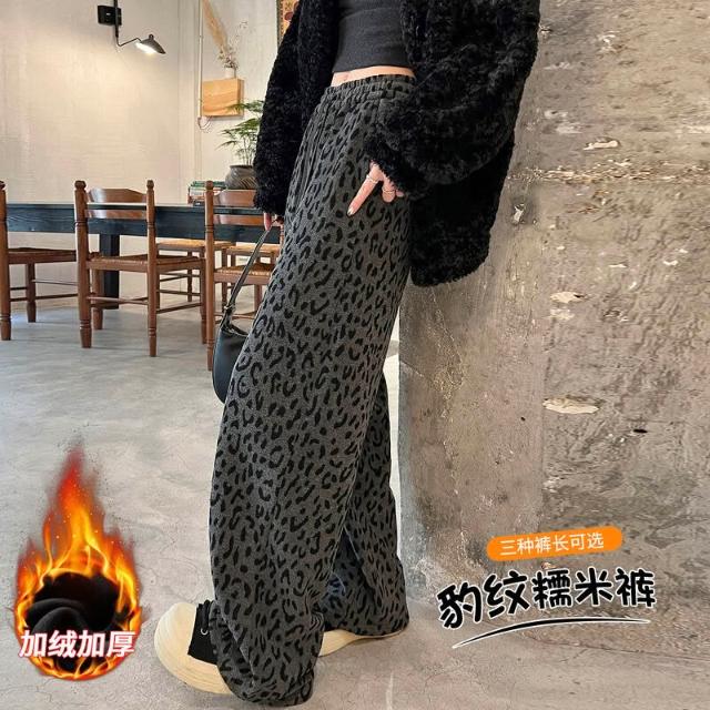 加絨羊絨豹紋闊腿褲女冬季高腰寬松垂感慵懶風休閑直筒拖地褲