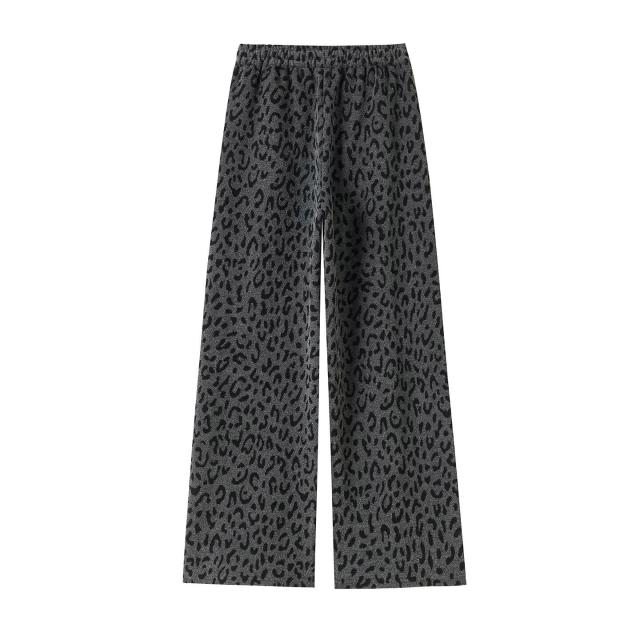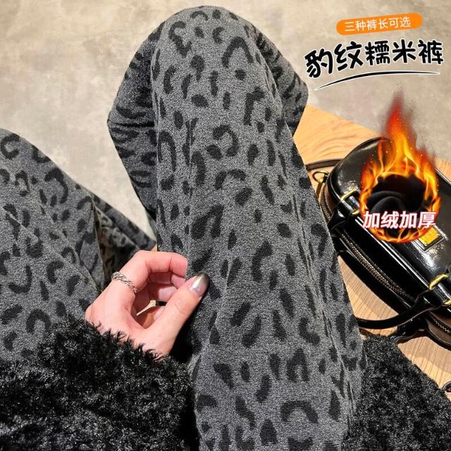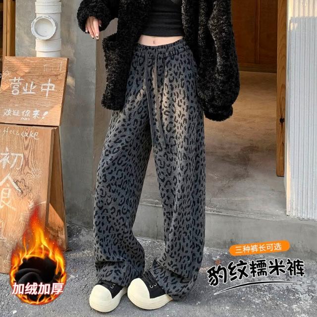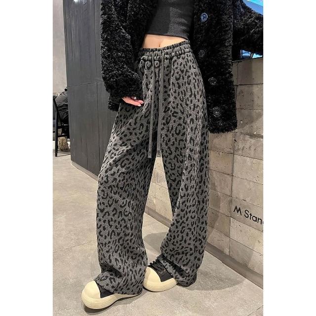 加絨羊絨豹紋闊腿褲女冬季高腰寬松垂感慵懶風休閑直筒拖地褲