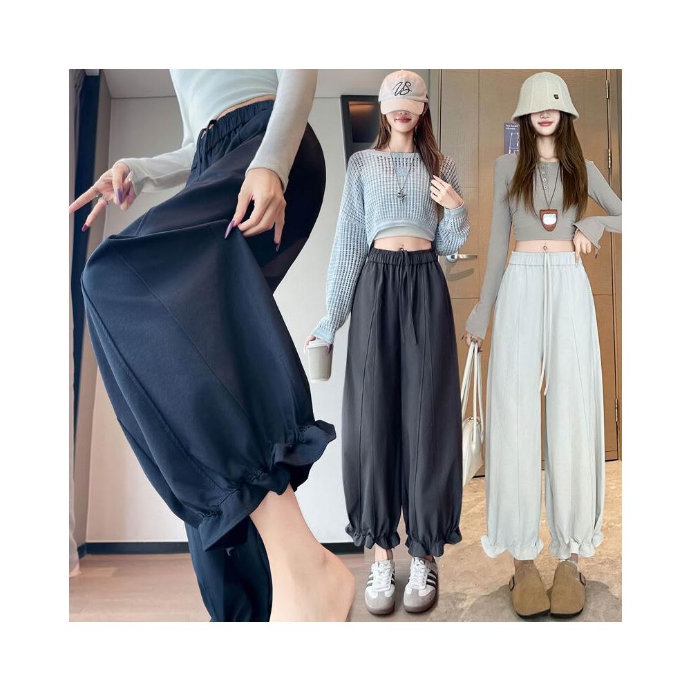 木耳邊花苞褲女春季松緊腰顯瘦寬松休閑闊腿九分哈倫燈籠褲