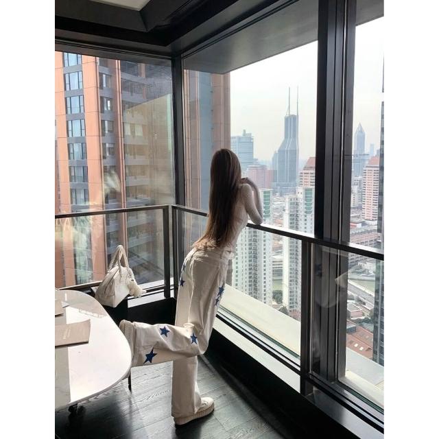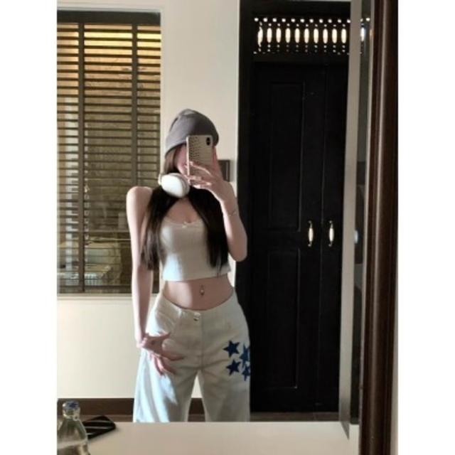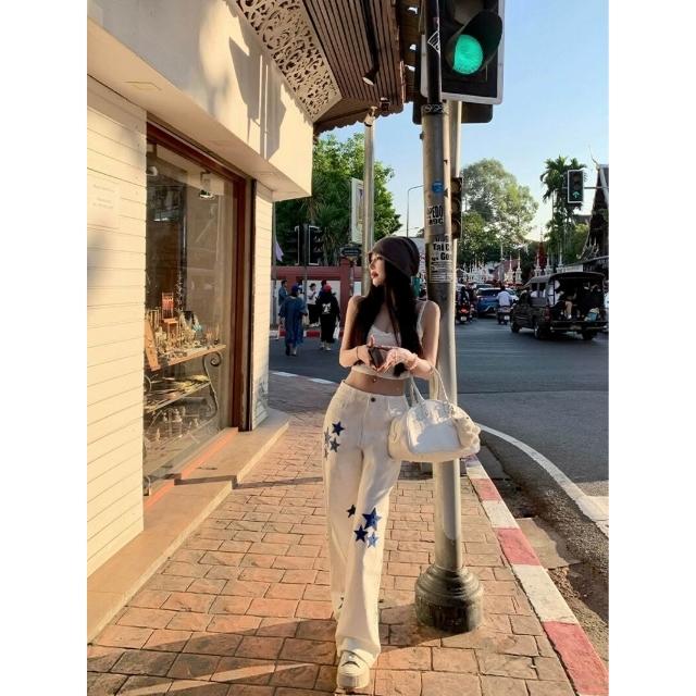 titi小姐姐克羅假日白色牛仔褲女春季星星皮標顯瘦寬松直筒褲