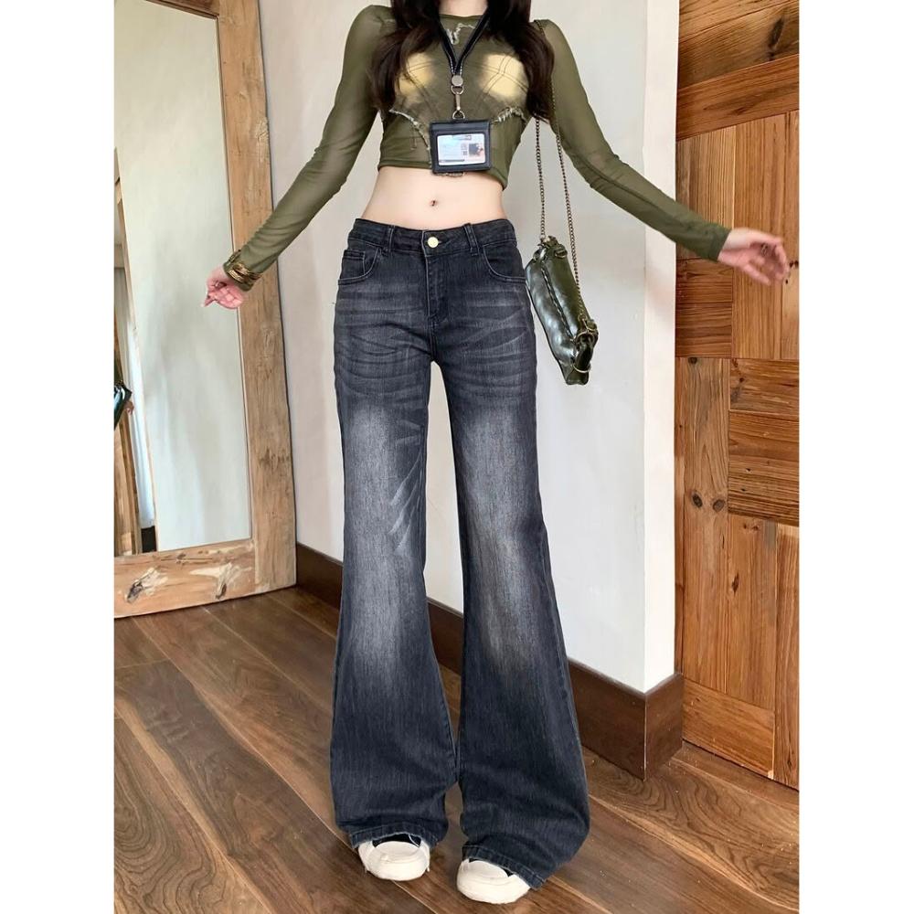 美式辣妹黑灰色微喇牛仔褲女秋季設計感修身彈力顯瘦直筒喇叭褲子