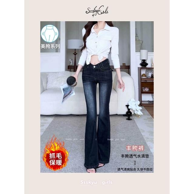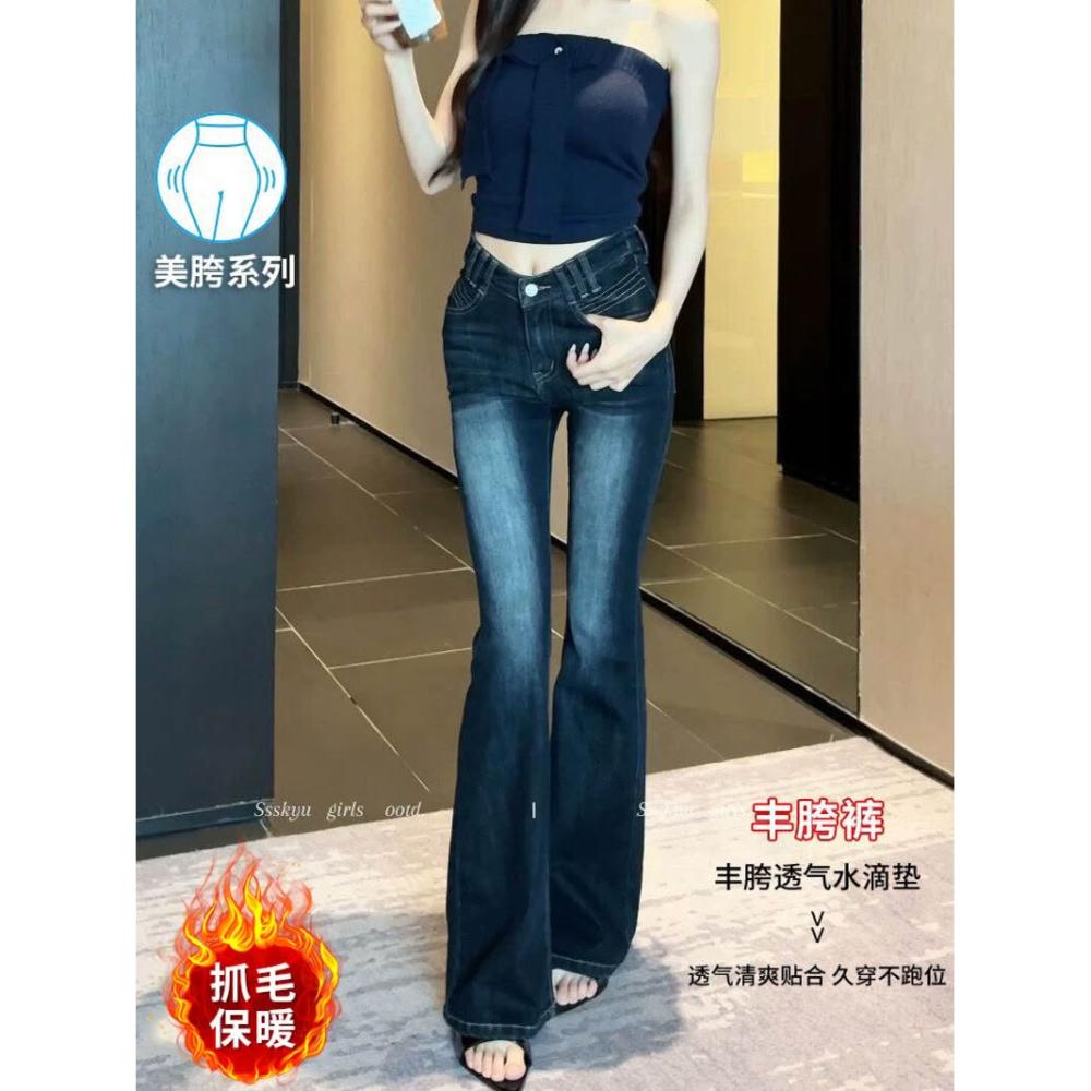 小兔泡花茶V腰豐胯冬新款微喇牛仔褲磨毛保暖復古辣妹顯瘦修身女