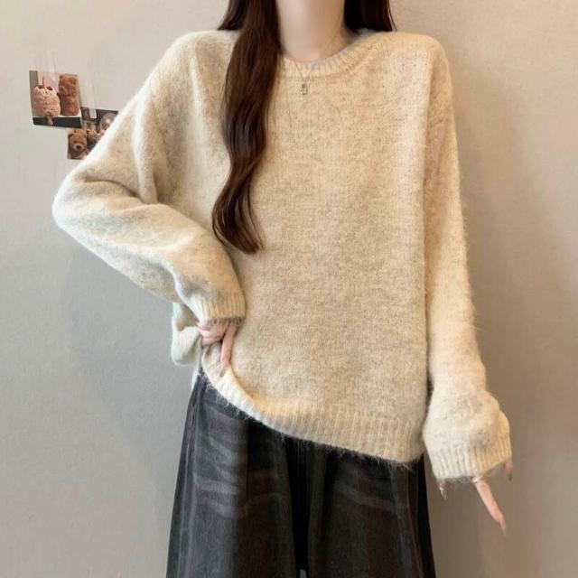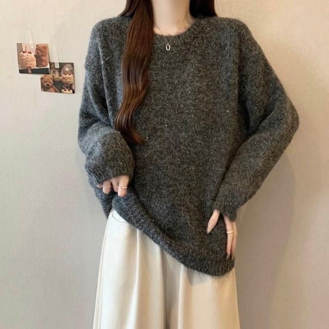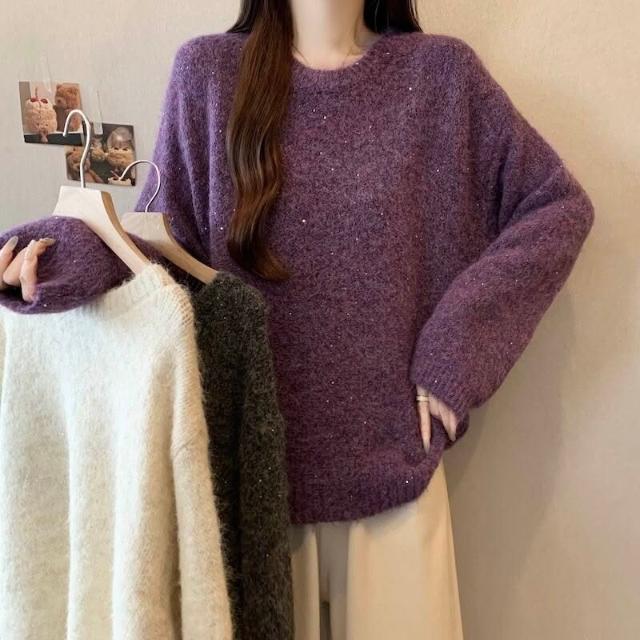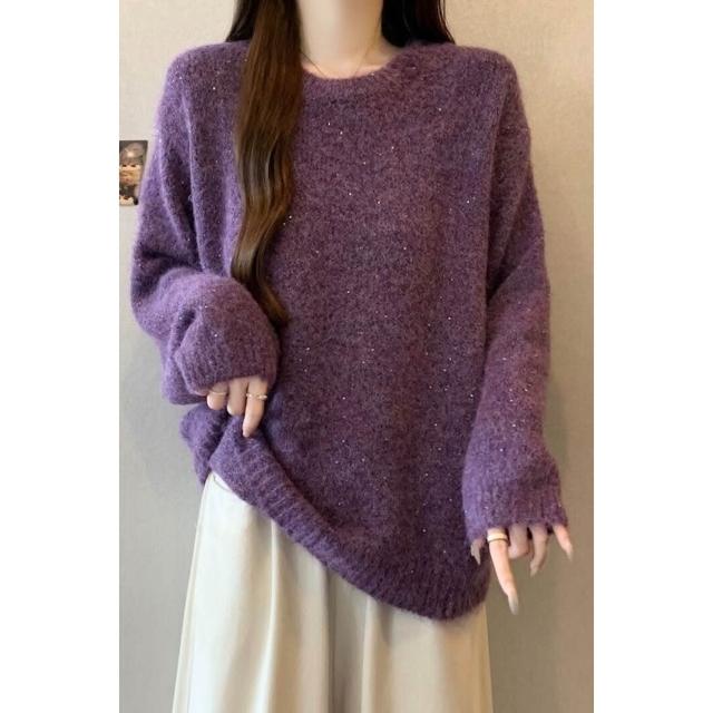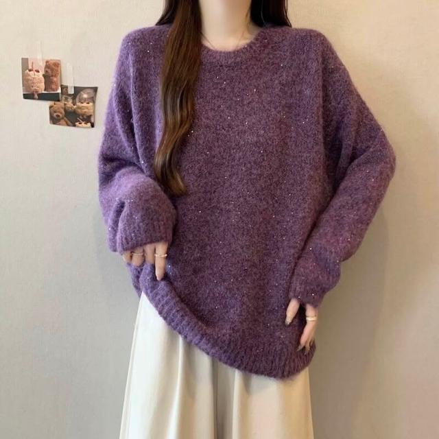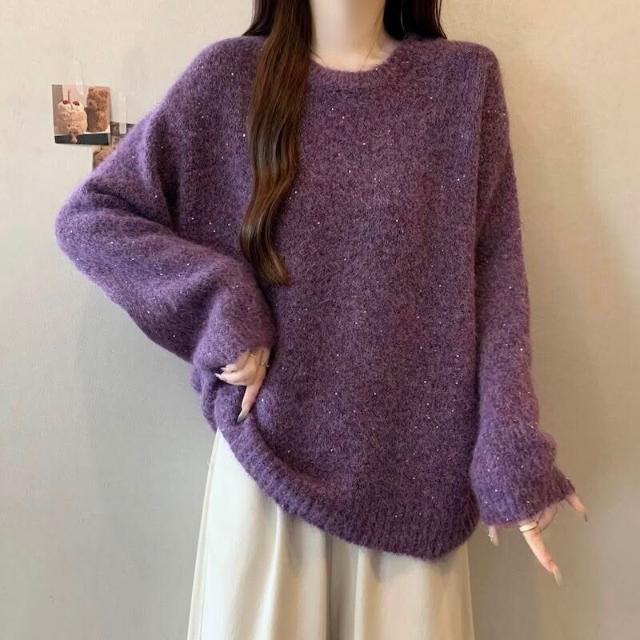 紫色正肩軟糯針織衫毛衣女2025秋冬大碼胖mm遮肉顯瘦打底毛衣