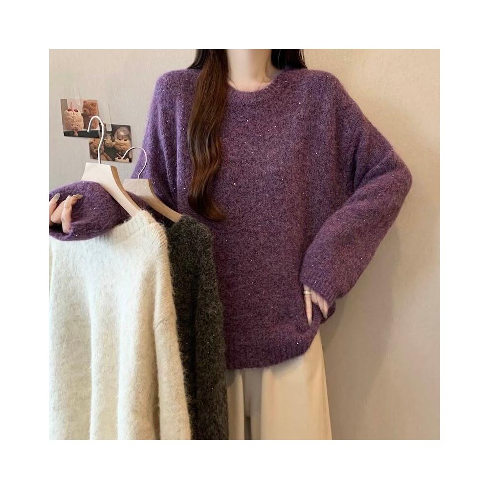 紫色正肩軟糯針織衫毛衣女2025秋冬大碼胖mm遮肉顯瘦打底毛衣