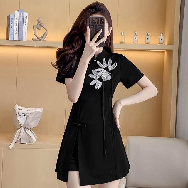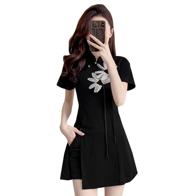 新中式國風兩件套氣質立體網紗花朵上衣配短裙套裝兩件套