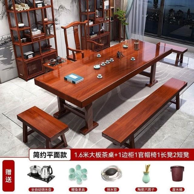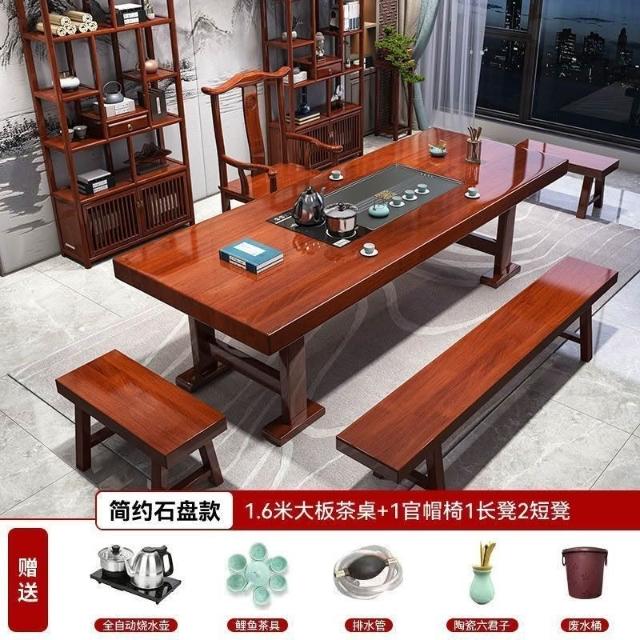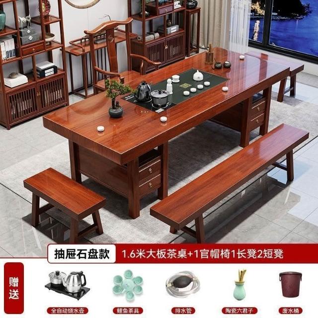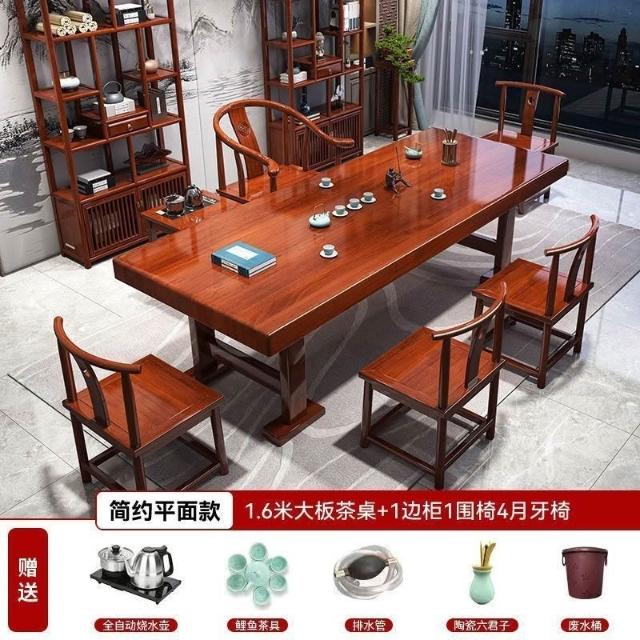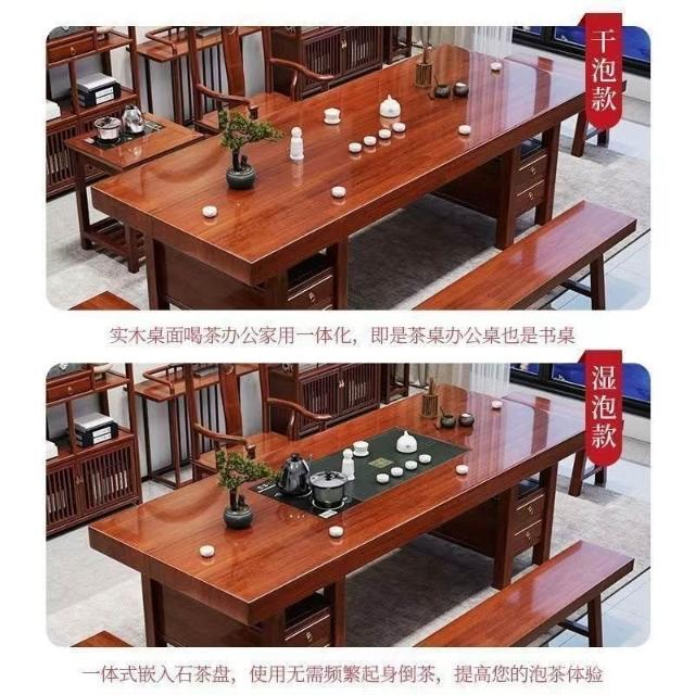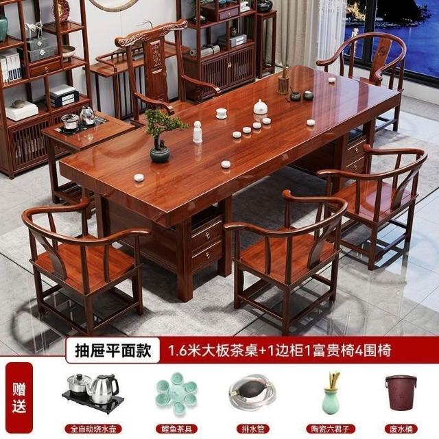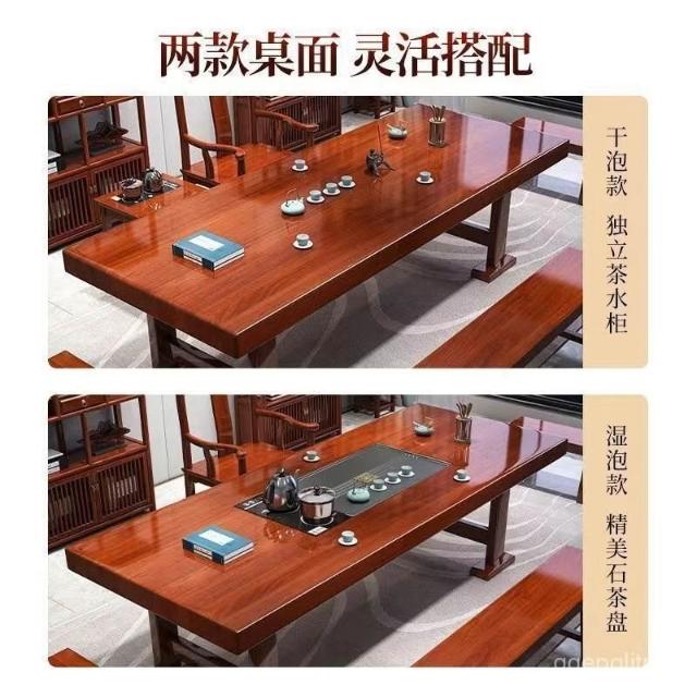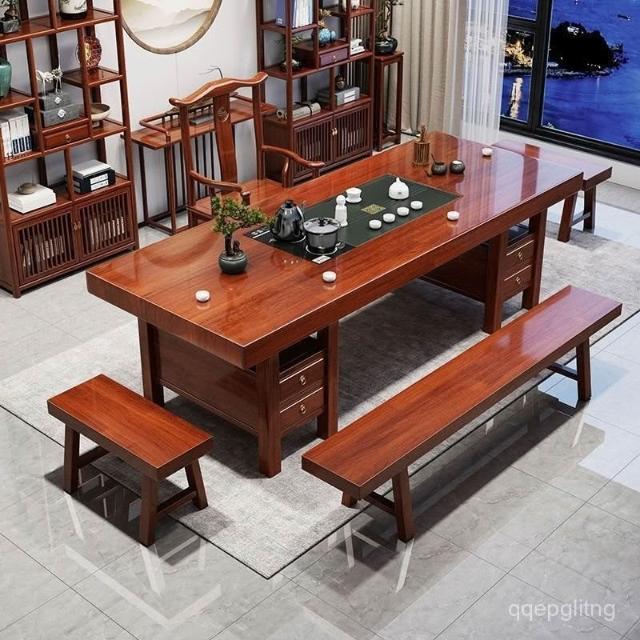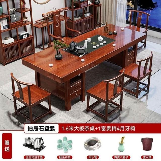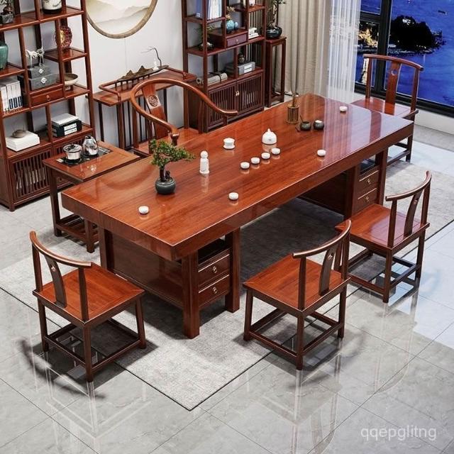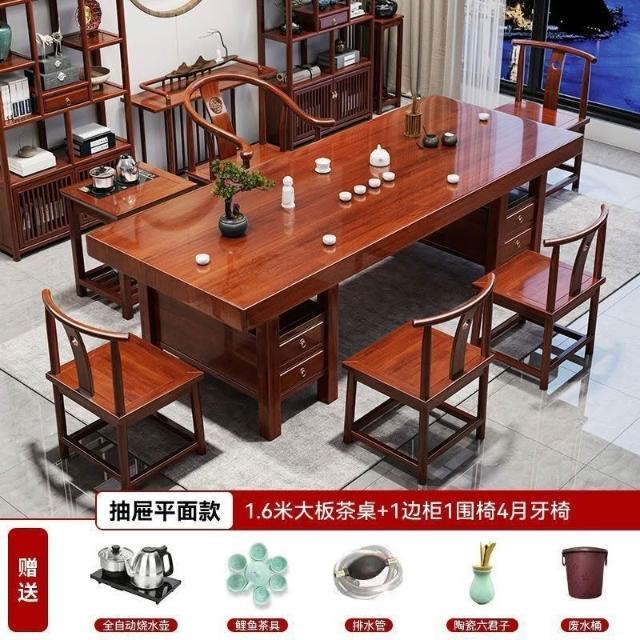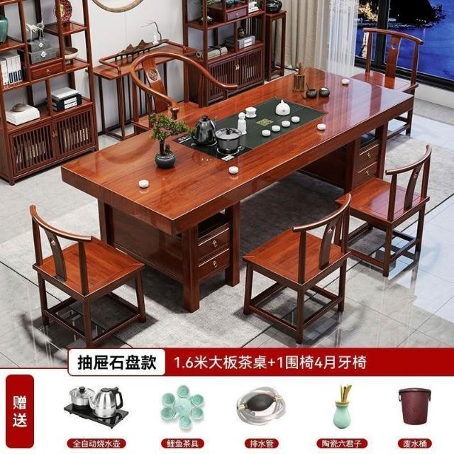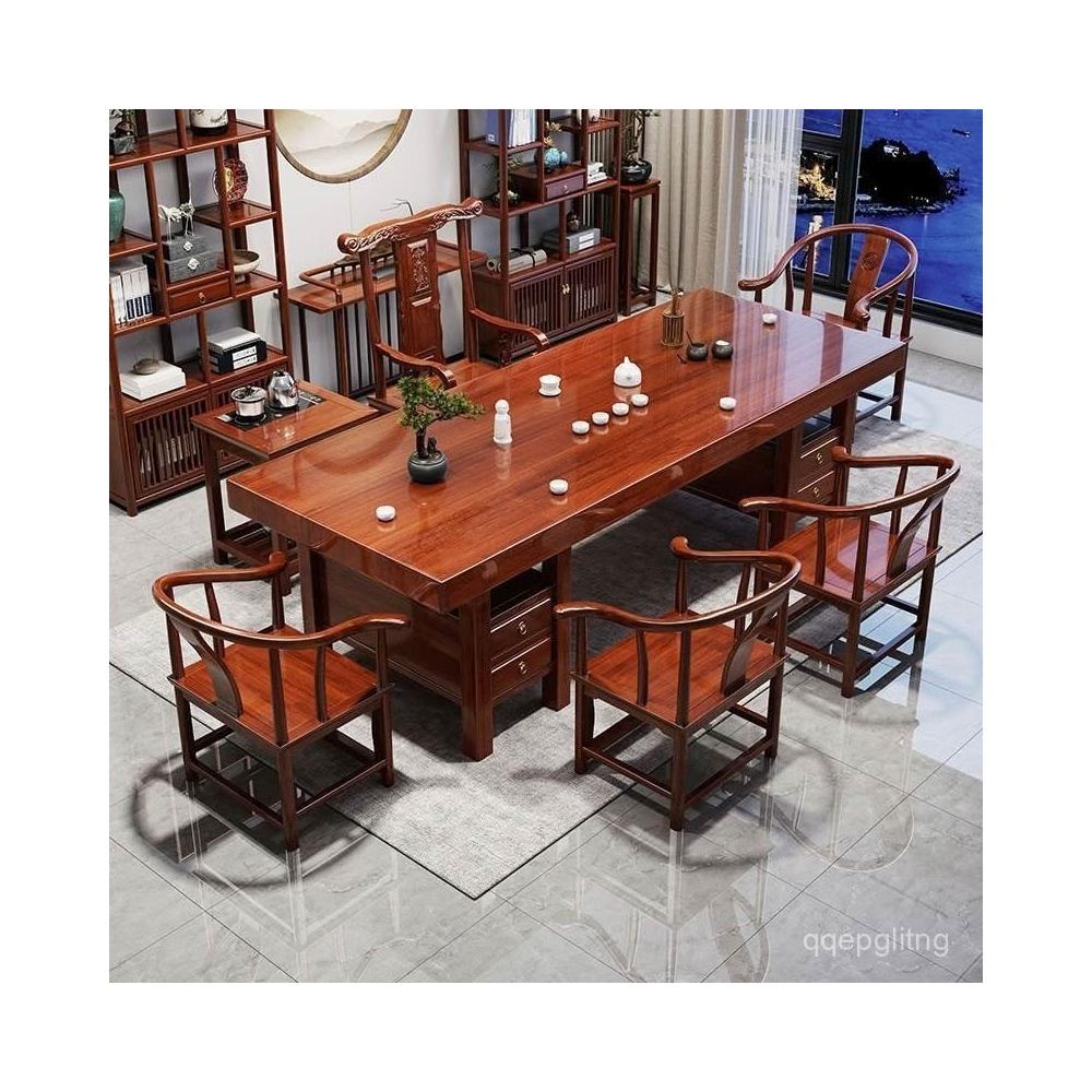 免運 工廠直銷 實木大闆花梨色茶桌椅組閤新中式功夫禪意泡茶臺辦公室茶具一整套 實木泡茶桌 功夫茶 實木桌