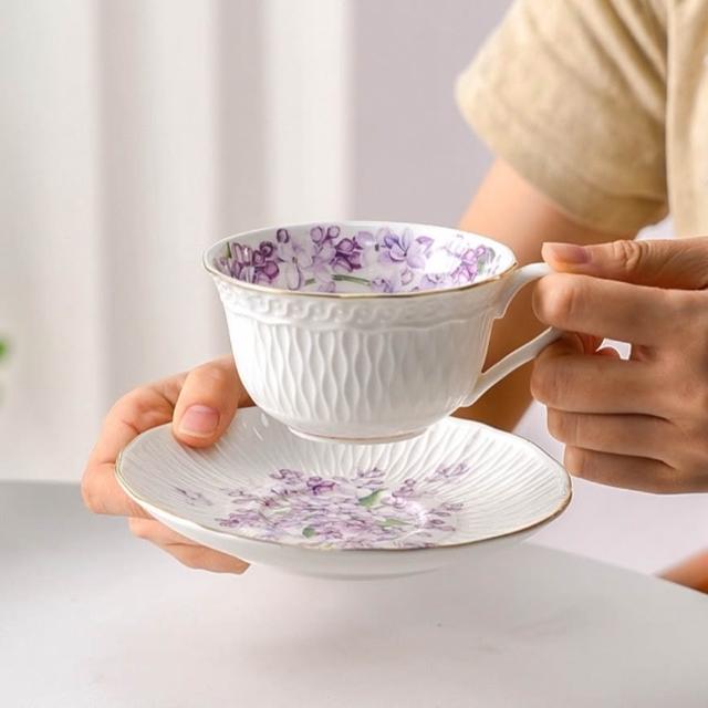 CAN YAO📍浮雕紫丁香 新骨瓷咖啡杯盤 兩杯兩盤 咖啡杯組 對杯組 咖啡杯禮盒 下午茶 杯組 禮品 贈品 花茶杯