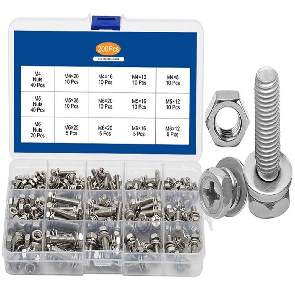M4M5M6螺絲套組304不銹鋼外六角三組合螺絲螺栓套裝200 PCS十字凹穴三組合螺絲套裝
