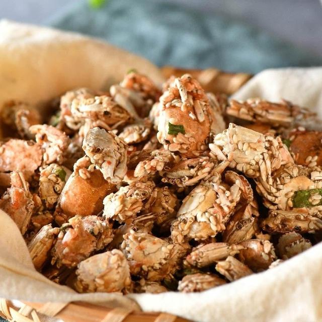 - 嚴選小花蟹整隻下鍋,酥炸到連殼