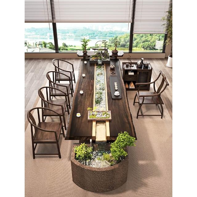 新中式迴圈流水養魚茶桌創意茶臺景觀一體曲水流觴實木茶桌椅組合