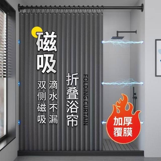 贈送皮質綁帶浴室摺叠浴簾 免打孔防水防霉布 衛生間隔斷淋浴 乾濕分離浴簾 磁吸防霉浴簾 浴室遮擋簾子