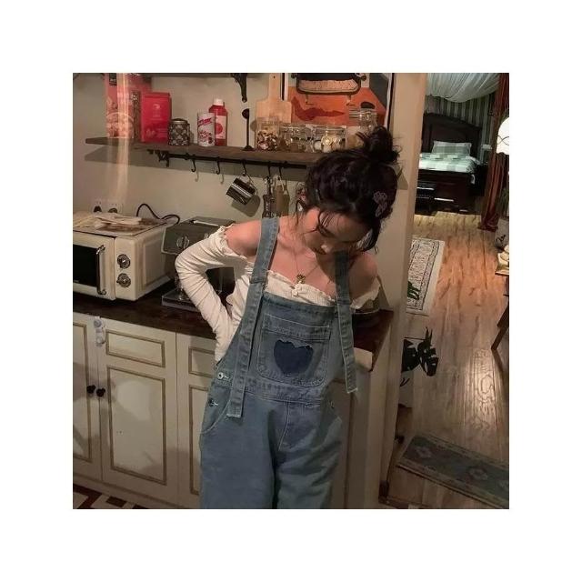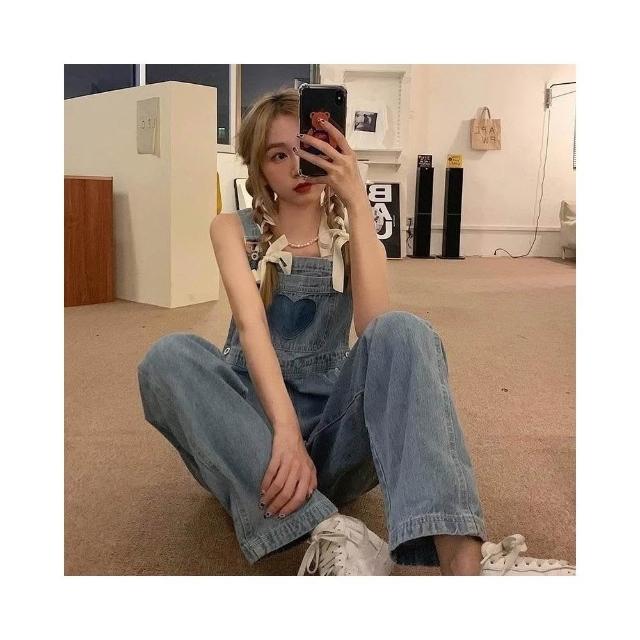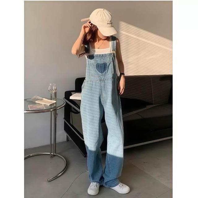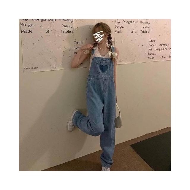 CHILL 現貨 韓系牛仔愛心吊帶牛仔褲 女生 牛仔背帶褲 小個子連衣褲子 寬鬆減齡 吊帶褲