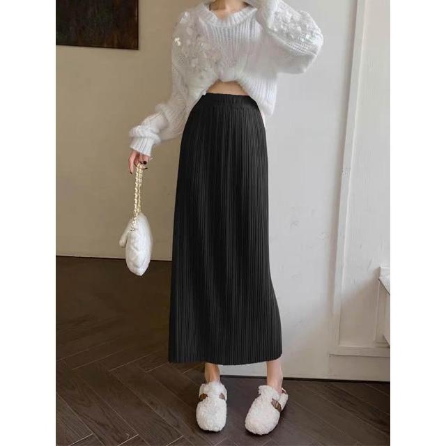 CHILL現貨 鬆緊腰壓摺百摺裙 壓紋坑條 中長款 長裙 高腰顯瘦半身裙 高腰裙 百褶裙