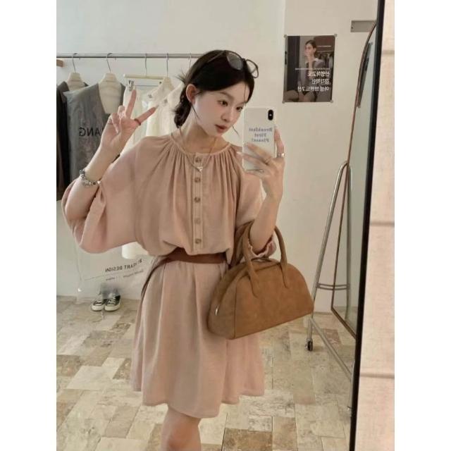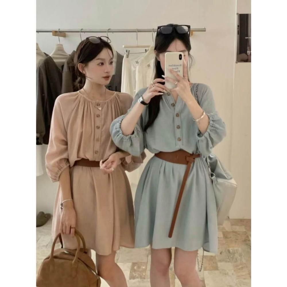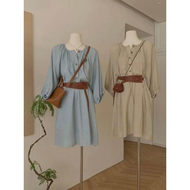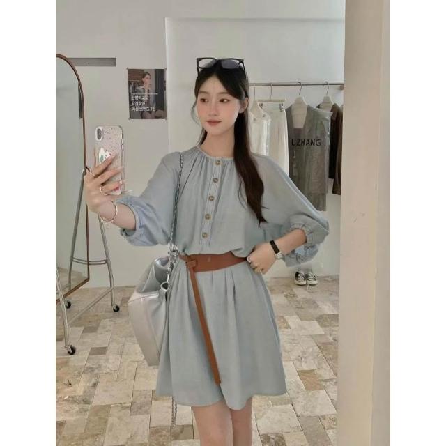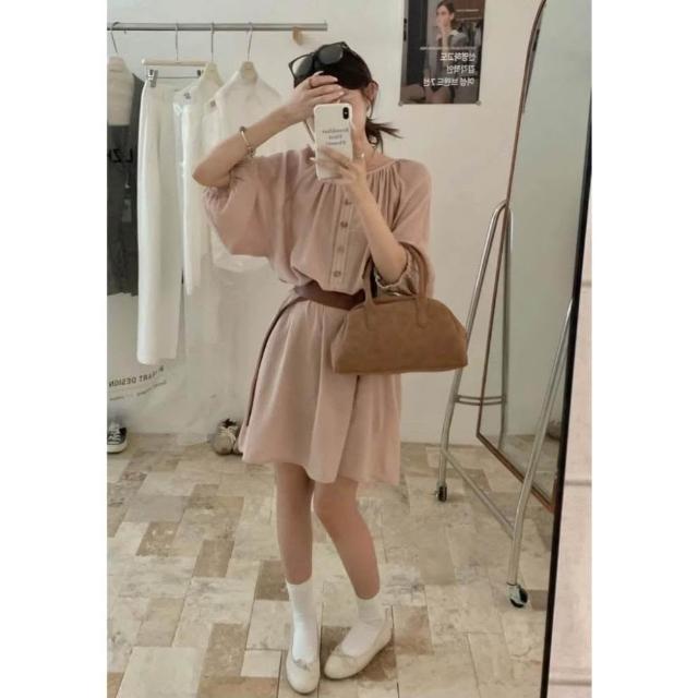 CHILL現貨 韓系慵懶圓領排釦附皮帶短洋 日系洋裝 渡假風洋裝 女生洋裝 素面短洋 短洋 法式短洋