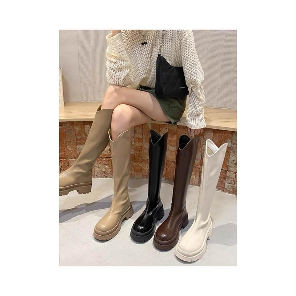 厚底V口長靴白色中筒馬丁靴 高筒靴 長筒靴 騎士靴