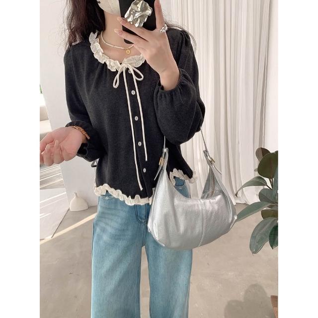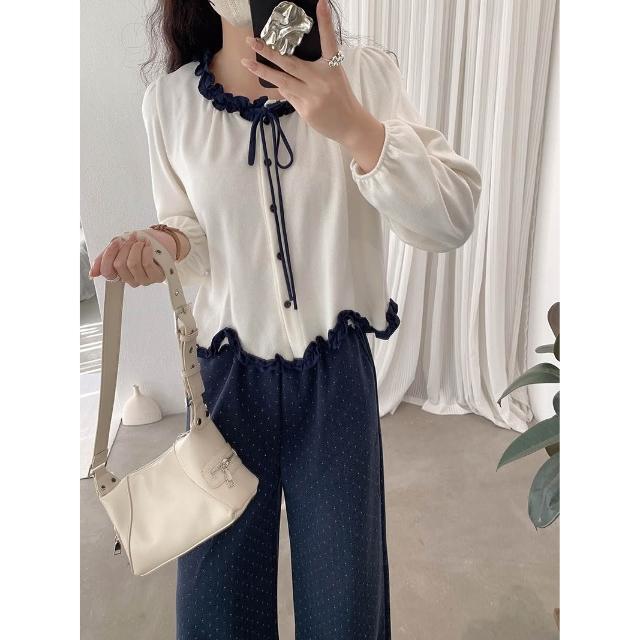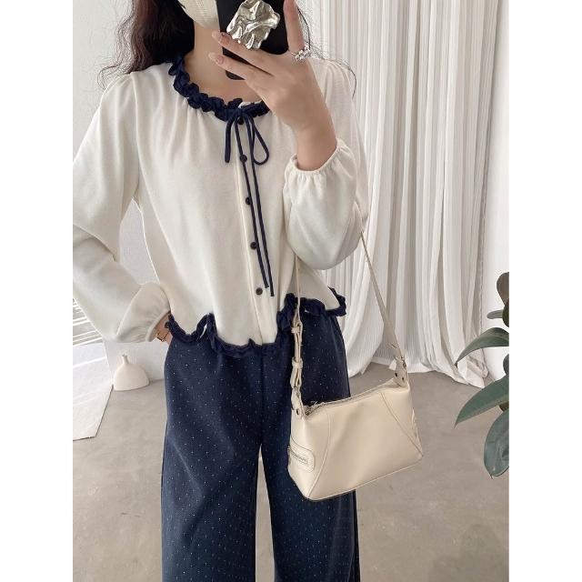 木耳邊不規則波浪下擺蝴蝶結綁帶長袖上衣🤍現貨🤍法式溫柔風荷葉滾邊上衣 雙色拼接綁帶設計 小香風荷葉邊綁帶上衣