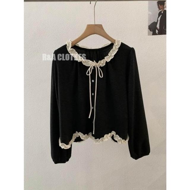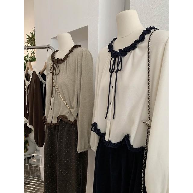 木耳邊不規則波浪下擺蝴蝶結綁帶長袖上衣🤍現貨🤍法式溫柔風荷葉滾邊上衣 雙色拼接綁帶設計 小香風荷葉邊綁帶上衣