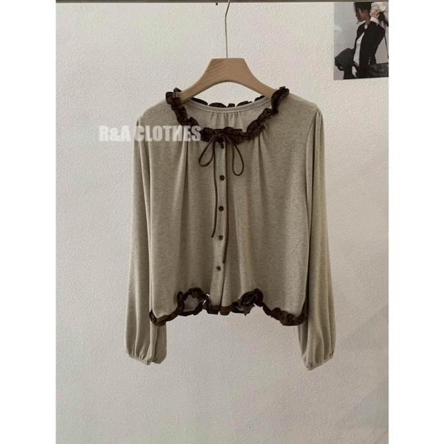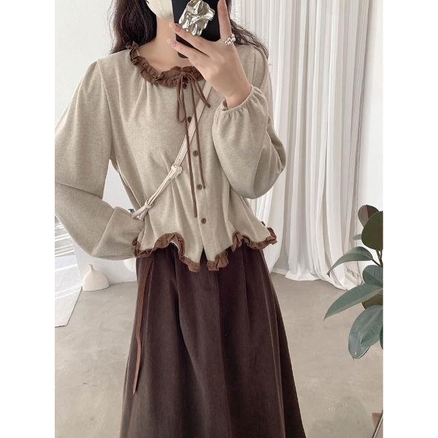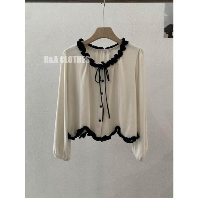 木耳邊不規則波浪下擺蝴蝶結綁帶長袖上衣🤍現貨🤍法式溫柔風荷葉滾邊上衣 雙色拼接綁帶設計 小香風荷葉邊綁帶上衣