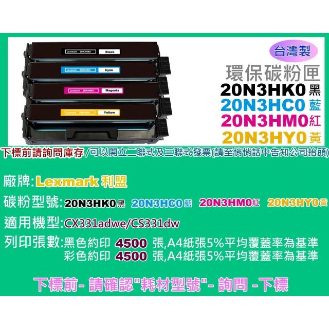 Lexmark碳粉補給站【台製】CX331adwe/CS331dw碳粉匣20N3HK0/20N3HC0/20N3HY0/20N3HM0