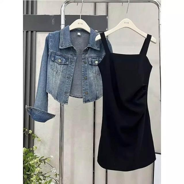 🎌日本工藝&柔軟親膚💨 禦姐輕熟風穿搭套裝女春秋季新款美式牛仔外套搭黑色吊帶裙兩件套