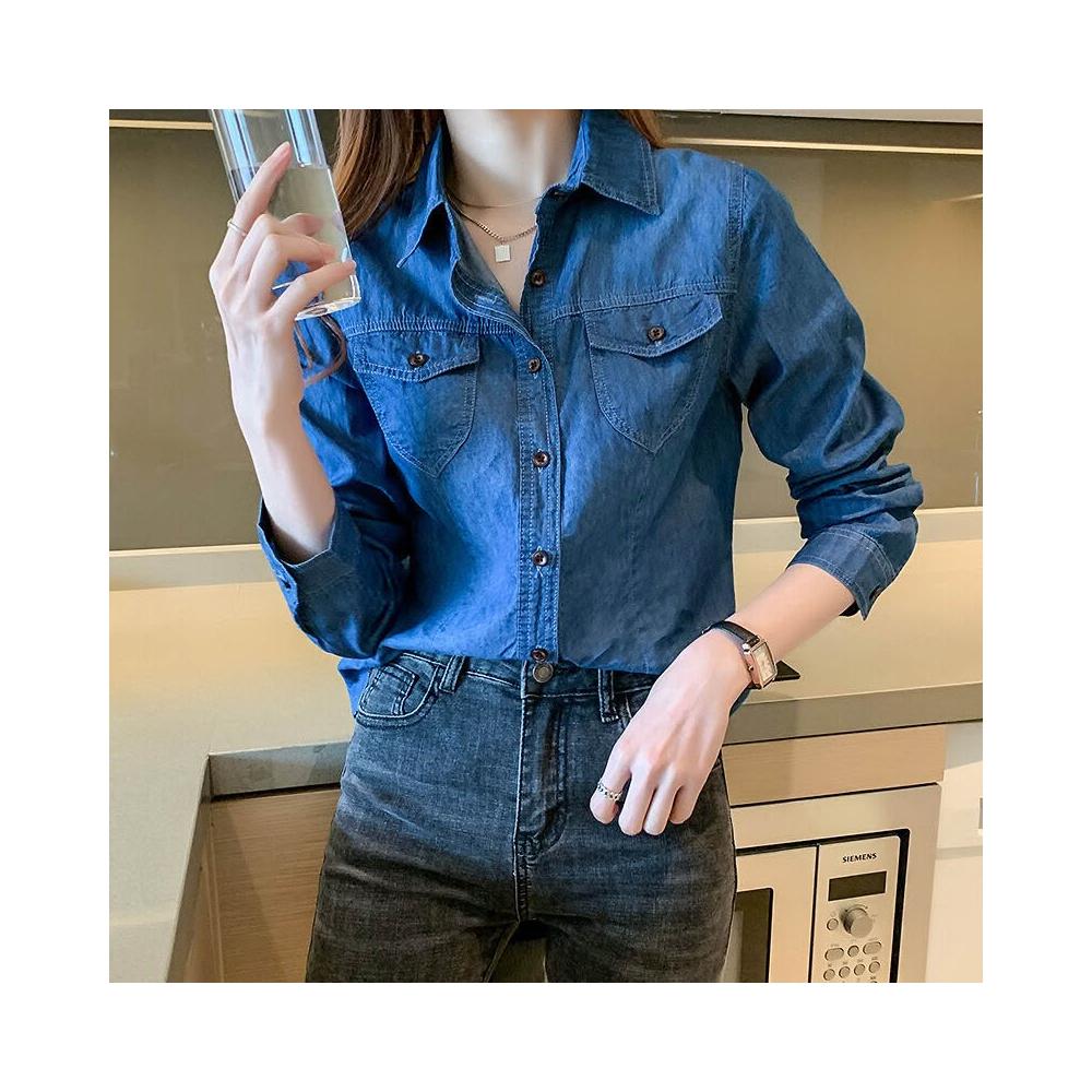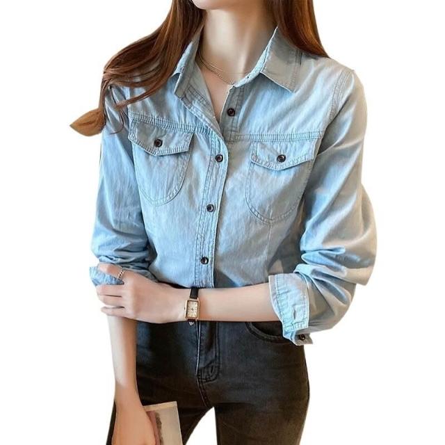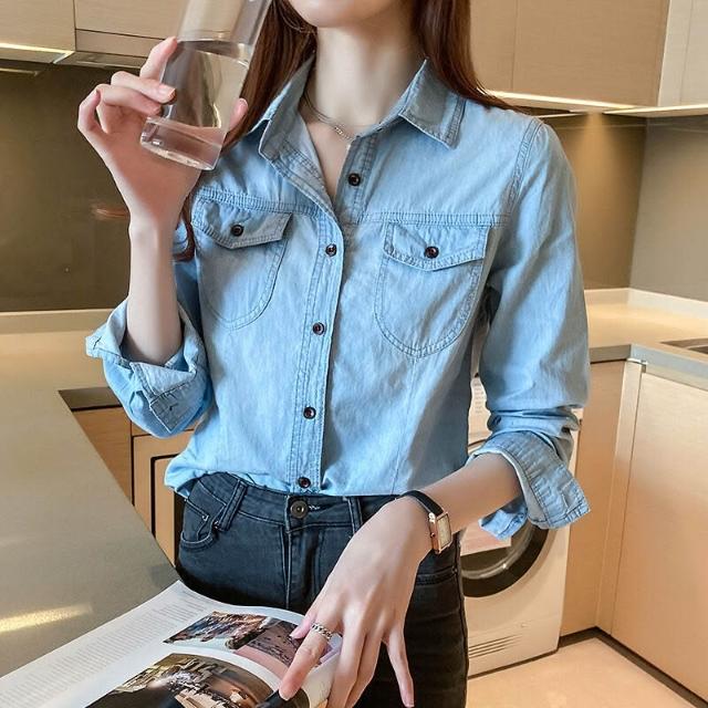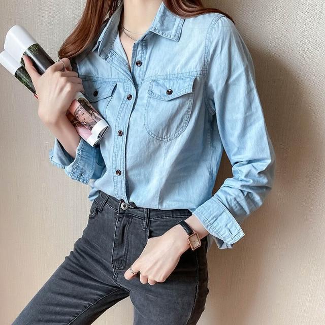 🎌日本工藝&柔軟親膚💨 牛仔襯衫女秋冬新款韓版長袖加絨chic港味襯衫打底衫修身上衣