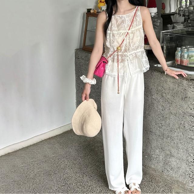 🎌日本工藝&柔軟親膚💨 冰氧夏日_自由呼吸感 抗皺抽繩直筒亞麻褲百搭拖地褲寬松闊腿褲