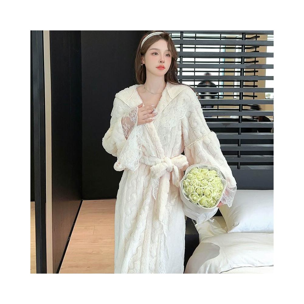 🧶棉柔面料 & 鬆緊舒適🩰 秋冬季提花珊瑚絨中長款睡袍連帽法式性感蕾絲邊系帶法蘭絨家居服