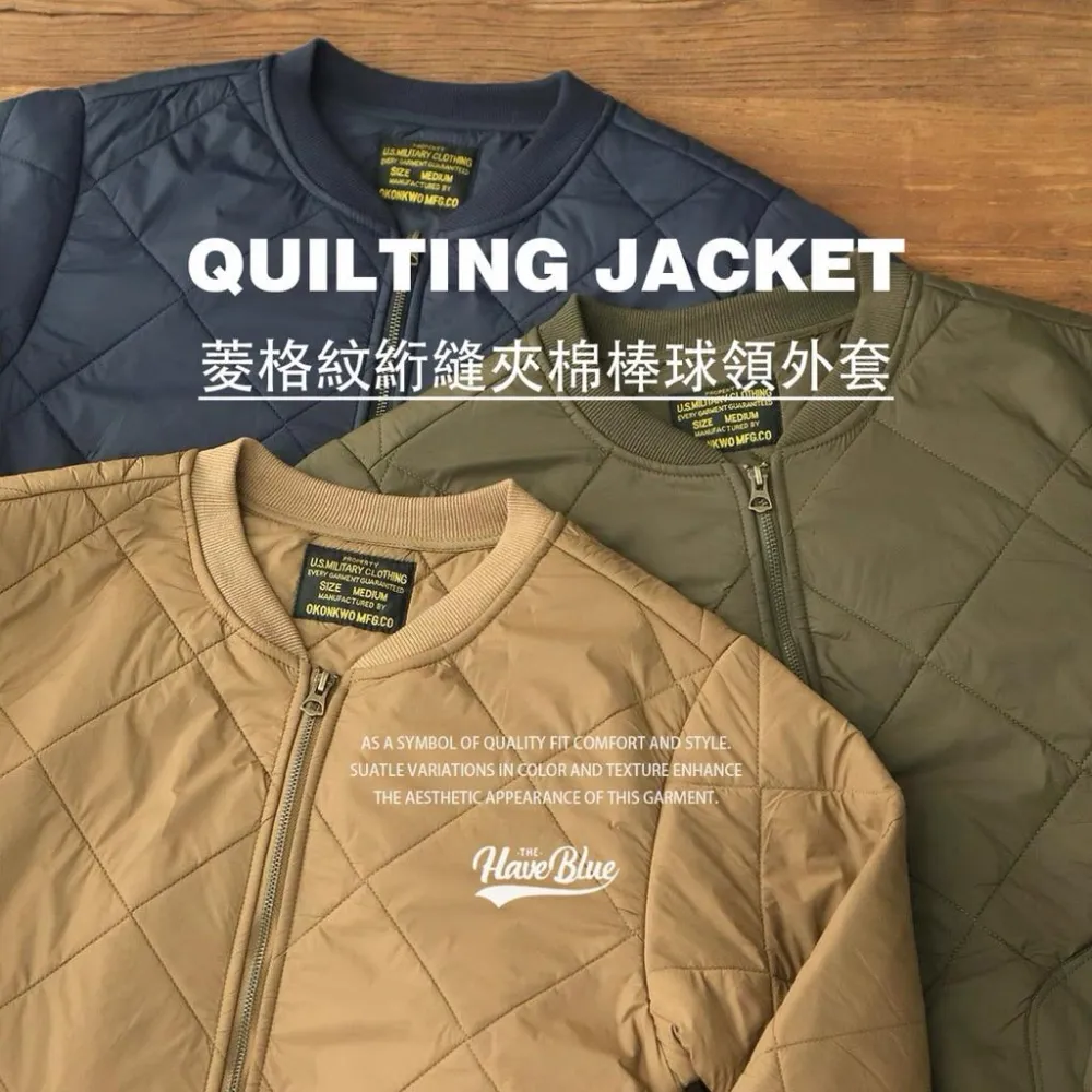 菱格紋絎縫夾棉棒球領外套 輕量保暖工裝夾克 復古軍風設計
