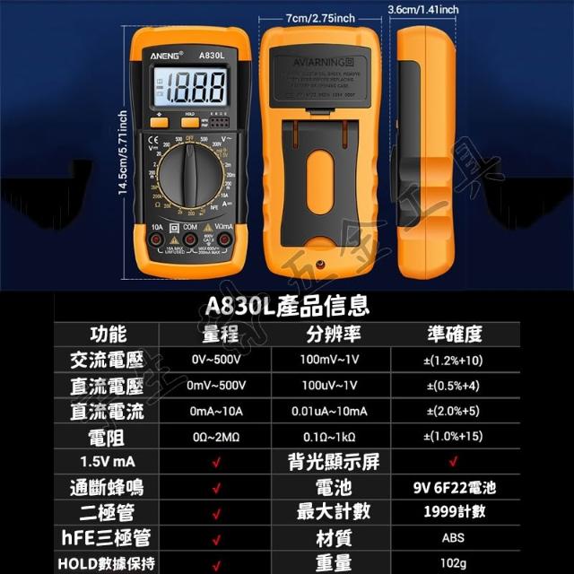 🔧三用電錶 萬用表 三用電表 數位電錶 萬用電表 電表 數顯 高精度 測電流 測電壓 A830L ANENG