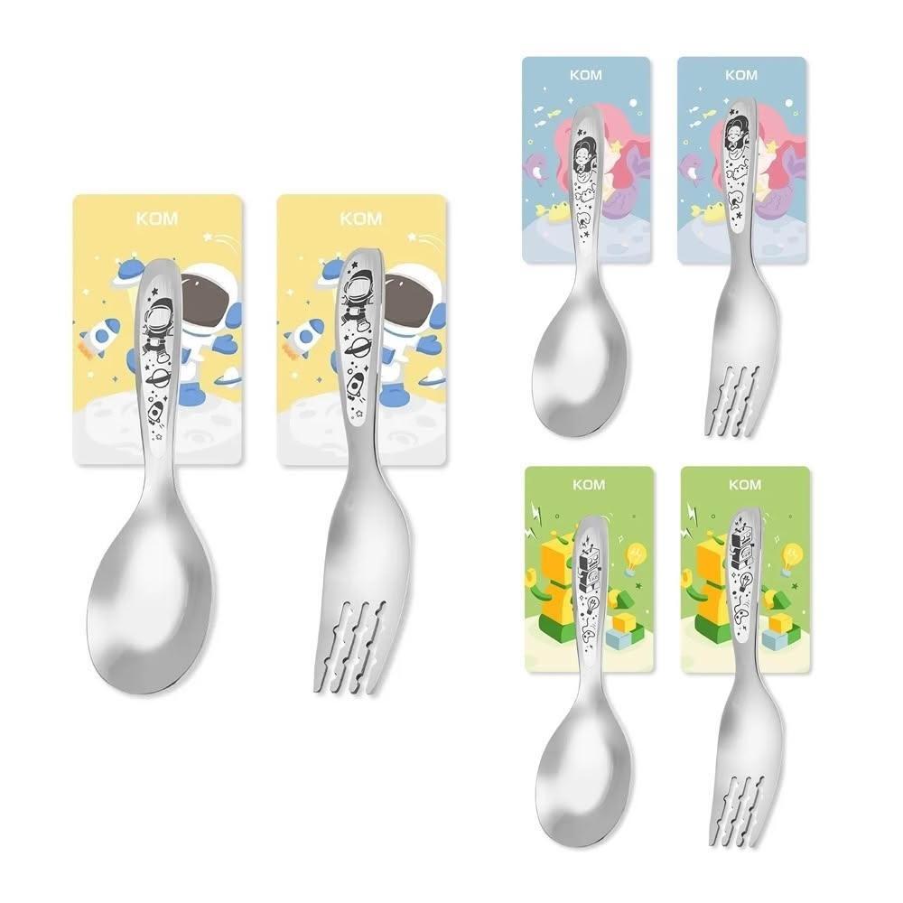 KOM316不鏽鋼兒童餐具 (童趣系列) 不鏽鋼湯匙 不鏽鋼叉子 餐具 兒童餐具 美人魚 太空人 機器人 寶寶學習餐具 湯叉組