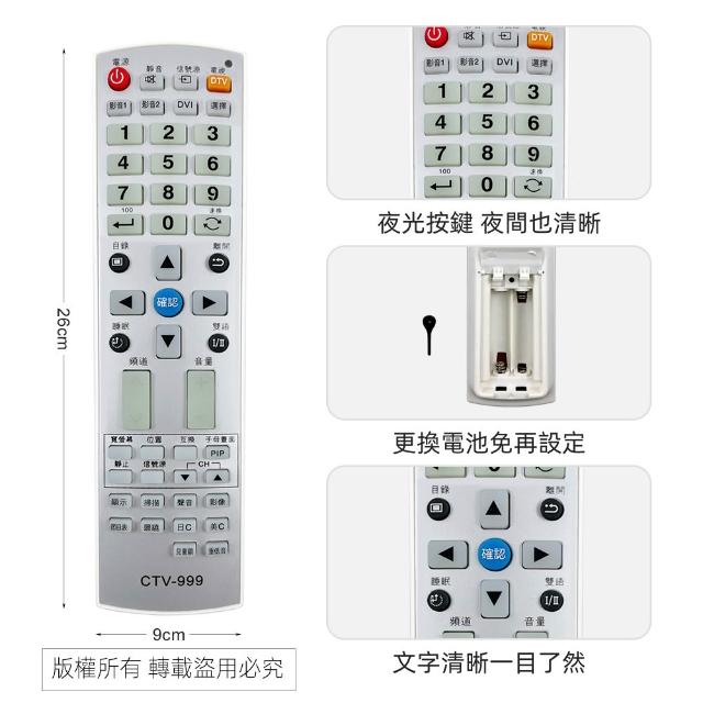 遙控大王 CTV-999 電視萬用型遙控器 夜光按鍵 斷電記憶 二號電池供電