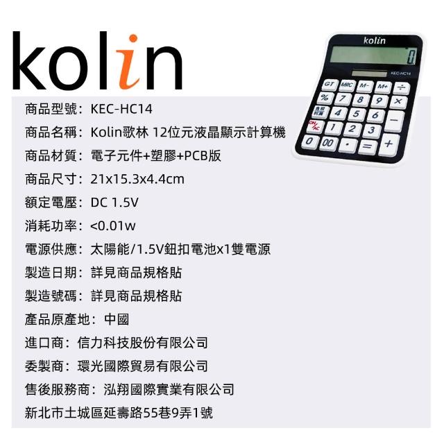Kolin 歌林Kolin 歌林 KEC-HC14 大計算機 12位元顯示 太陽能雙電源