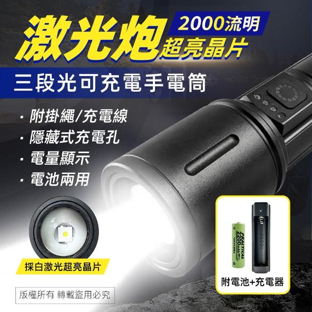 PRACTICAL 實用牌激光砲鋁合金可充電手電筒-大功率白激光/2000流明/三段光源/附充電線及掛繩(單品/組合)