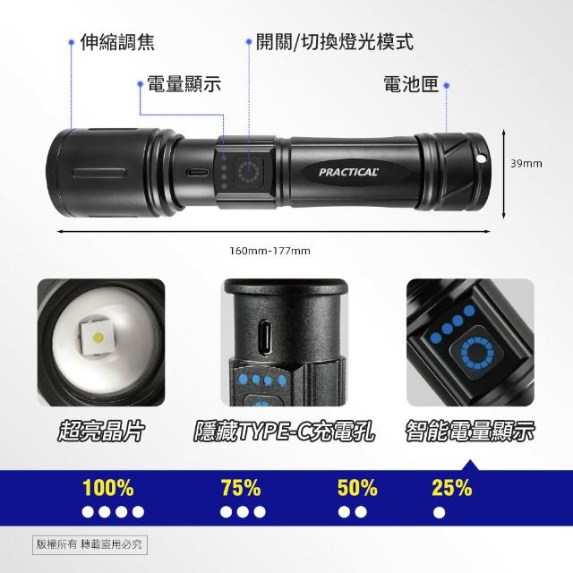 PRACTICAL 實用牌激光砲鋁合金可充電手電筒-大功率白激光/2000流明/三段光源/附充電線及掛繩(單品/組合)